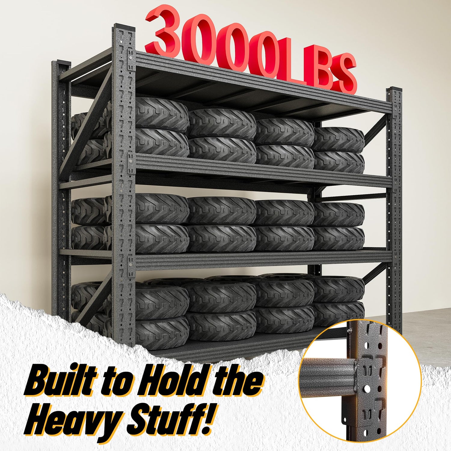 - 【Heavy-Duty Construction】Engineered with one-piece uprights and thickened beams that are wider and more durable than standard shelving, this garage shelving delivers exceptional structural integrity and reliably supports up to 3000 lbs total weight—ideal for heavy-duty garage storage.