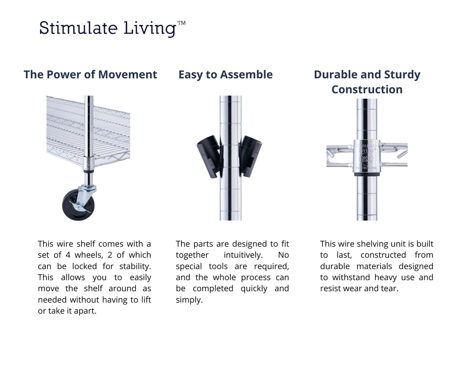 - â EASY ASSEMBLYâ Our Stimulate Living Wire Shelving is designed with simplicity in mind, making assembly quick and hassle-free. You can easily set it up in no time and start using it immediately.