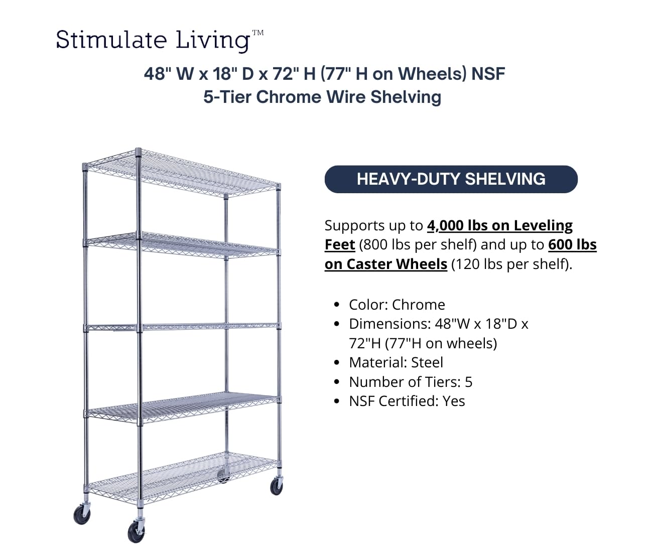 - â COMMERCIAL-GRADE QUALITY AND NSF CERTIFIEDâ Our Stimulate Living Wire Shelving units are constructed with premium-grade materials, ensuring that they can withstand the rigorous demands of commercial use while also being suitable for residential use. They are NSF / ANSI Standard 2 compliant, ensuring that they meet the highest standards of quality and safety for use in commercial and residential settings.