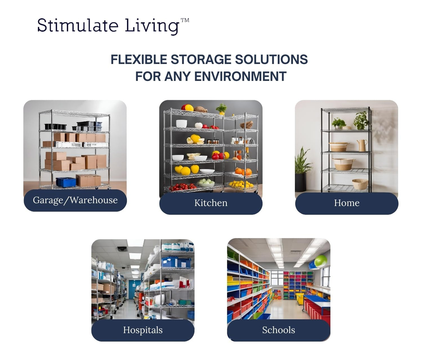 - â FLEXIBLE USAGEâ Our Stimulate Living Wire Shelving is designed to be flexible and adaptable to a wide range of settings. It can be used in warehouses to store heavy equipment, in kitchens to hold cooking utensils, in garages to organize tools, in hospitals and laboratories to store medical supplies, in offices to keep files and documents, in retail stores to display merchandise, in restaurants to store kitchenware, in factories to hold raw materials, and more.