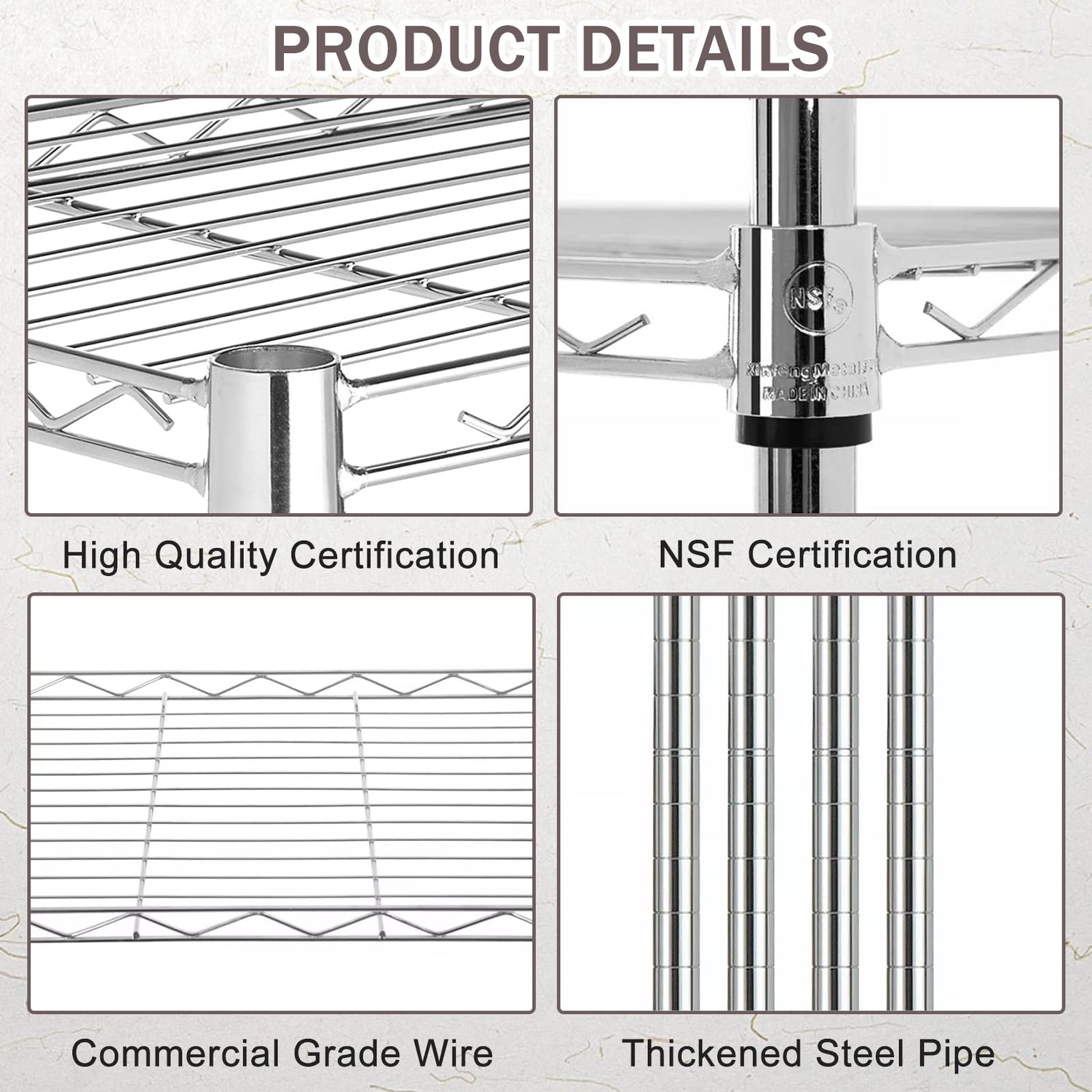 • Commercial Grade Shelving: High-quality certified wire shelving are made of high -intensity materials. They have strong toughness, high load capacity, toughness and resistance, which can effectively prevent metal shelf from bent when sufficient weight. The V-shaped mesh surface design enhances the bearing capacity. Friction plate design prevents mesh slippage and is NSF certified.