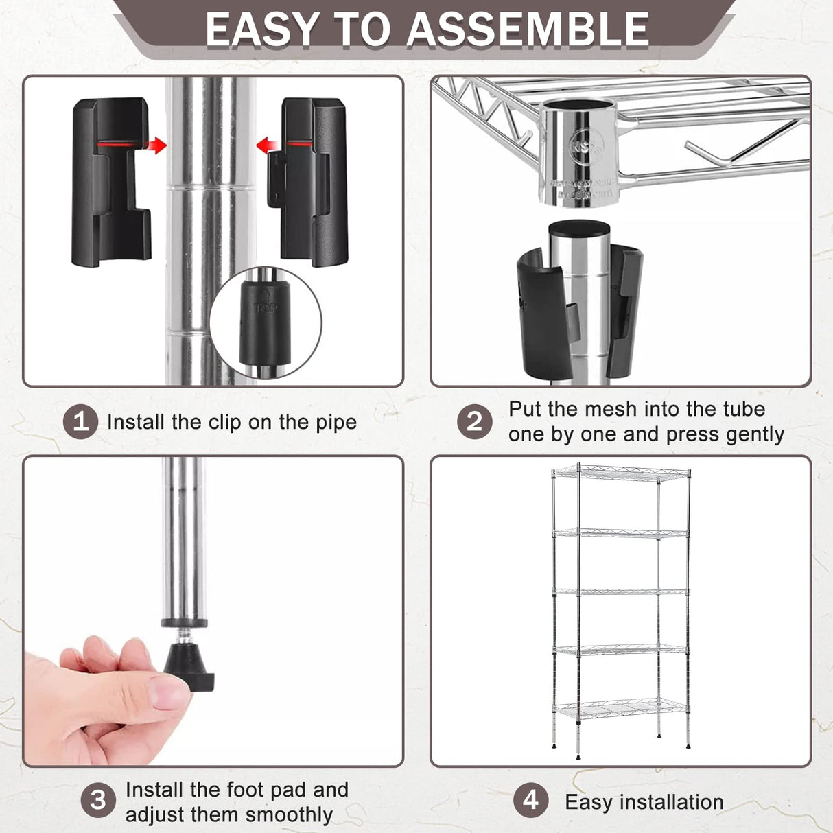 • Easy to Assemble: This is a very sturdy wire shelving unit. Very easy to put together, no tools needed. This utility kitchen shelf has a smooth coating surface, easy to clean, waterproof design and good corrosion resistance. Great for storage keeping things nice and neat easy access, great to put it anywhere shop, garage, kitchen, hallway, spare room.