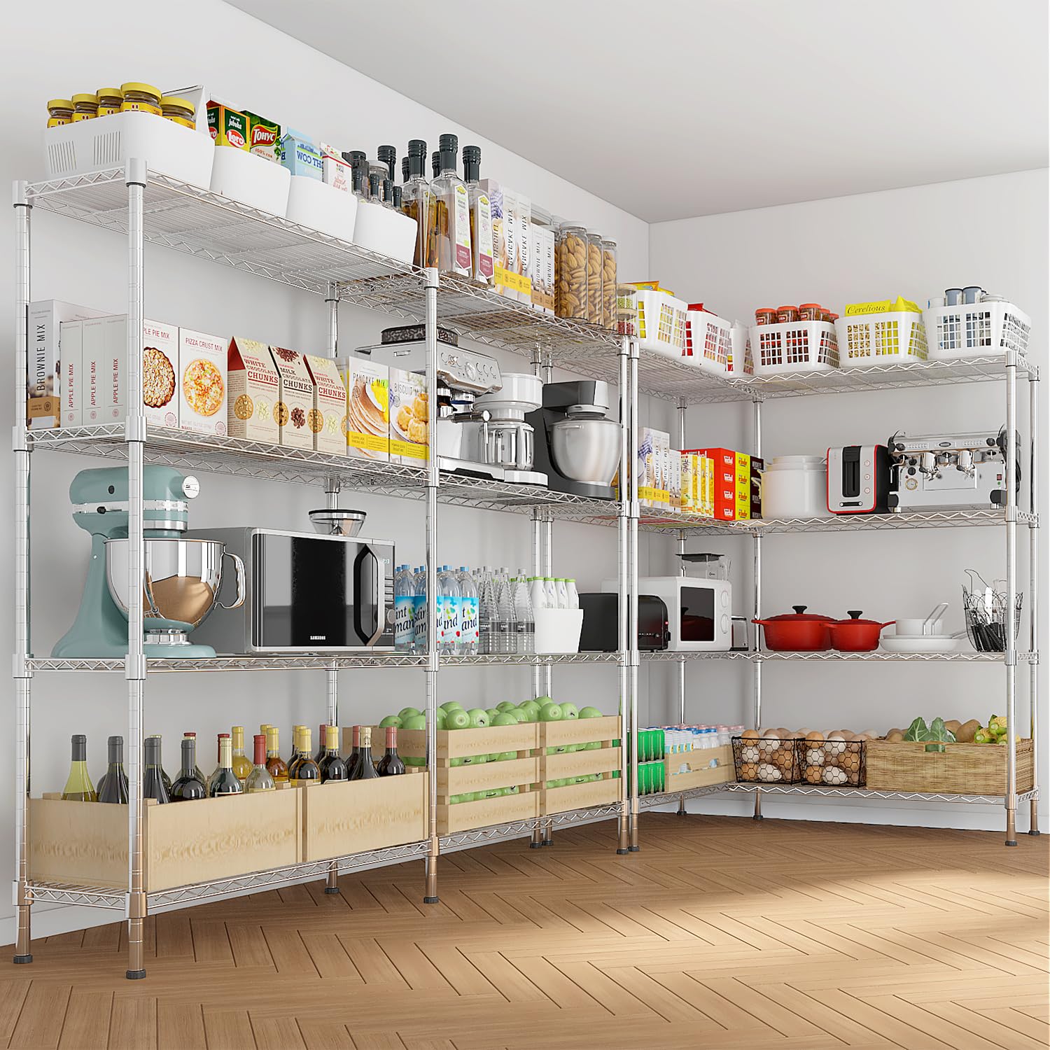 - Versatile Application: Suitable for garages, pantries, kitchens, supermarkets, and more, this shelving unit adapts to diverse storage needs in both residential and commercial settings