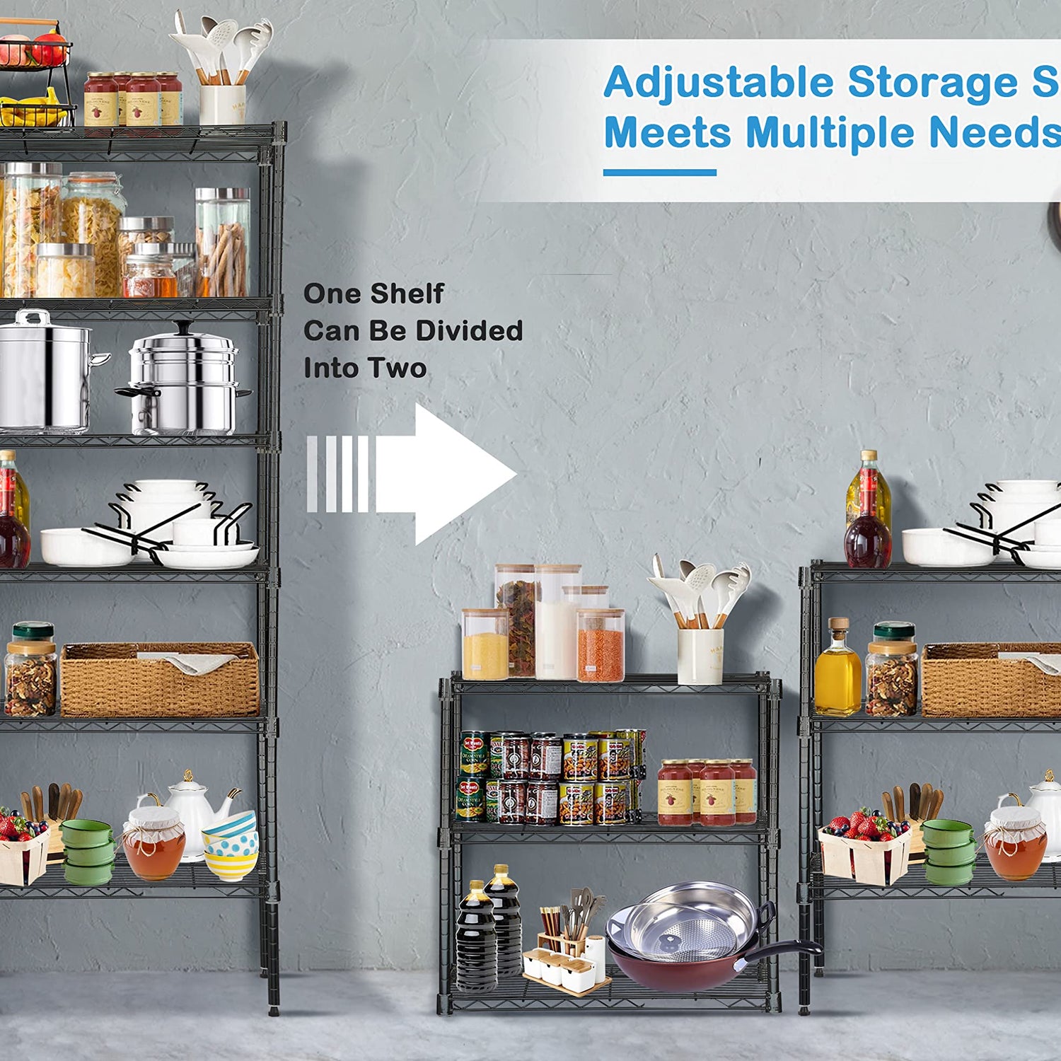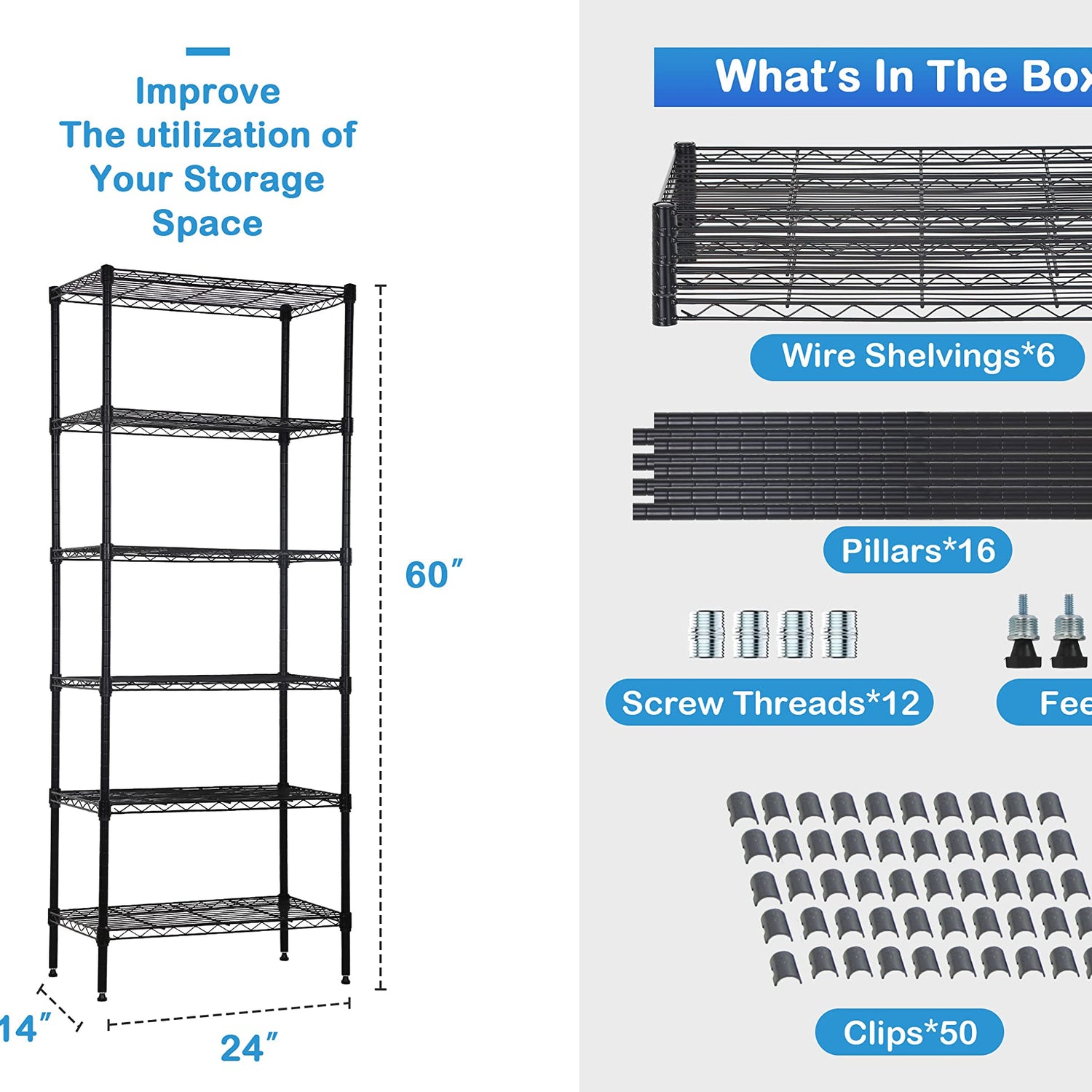 - 【6 Tier Storage Shelf】24"Lx14"Wx60"H, Can be used for pantry organizer, plant display, garage storage. Storing your food, pots and pans, books, tire, tools or other heavy items.Organize your messy/heavy items into neat condition instantly and effortlessly.