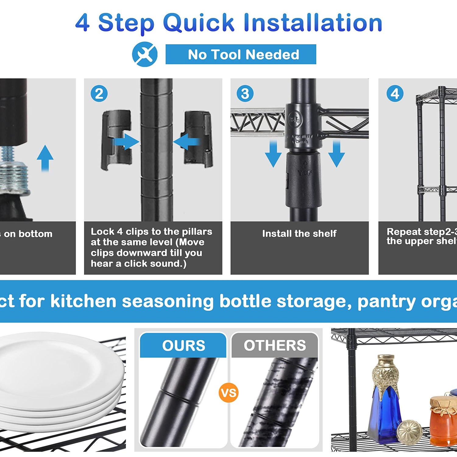 - 【EASY TO ASSEMBLE】No tools needed to install this wire shelves in 15 minutes. All parts packaged in 1 package. Installation video and instructions are available in listing page. If you have any questions, please feel free to contact us. Professional customer service will reply your questions within 24 hours.