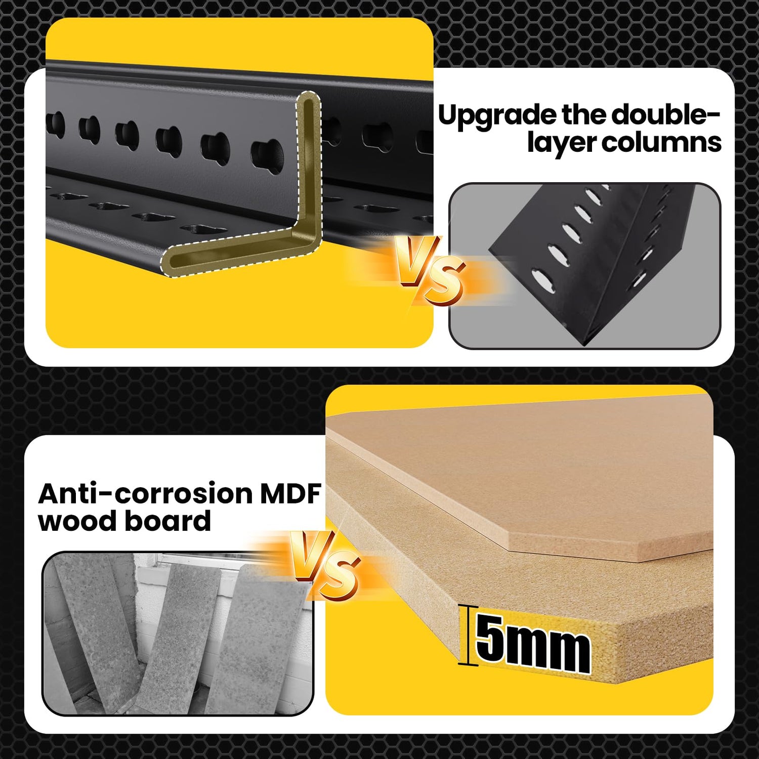 - 【2000-pound ultra-strong load capacity】In modern factory, we use professional mechanized equipment to manufacture double-layer column garage shelving that are 7 mm thick and 2 inches wide, with a load capacity far exceeding that of ordinary shelves. The surface of the metal columns is treated with a nano-level powder high-temperature curing spray coating process to form a 0.3 mm ultra-dense anti-rust and anti-scratch coating that can withstand the harshest garage environments.