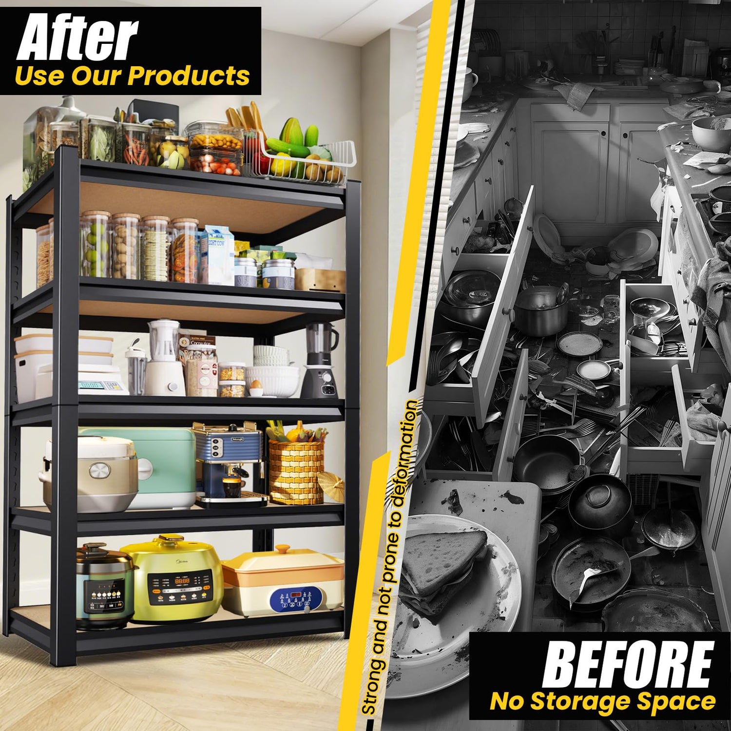 - 【One Becomes Two】 This 5-tier metal garage shelving supports one-step splitting and recombination, easily transforming into two independent shelves: a 3-tier shelf and a 2-tier shelf. It effortlessly handles diverse storage needs for tools, office supplies, miscellaneous items, and more. When a single shelf is too small and multiple large shelves take up too much space, this is the ideal choice. A single storage shelves can create a snack storage area and a tool storage area, perfectly meeting all storage needs!