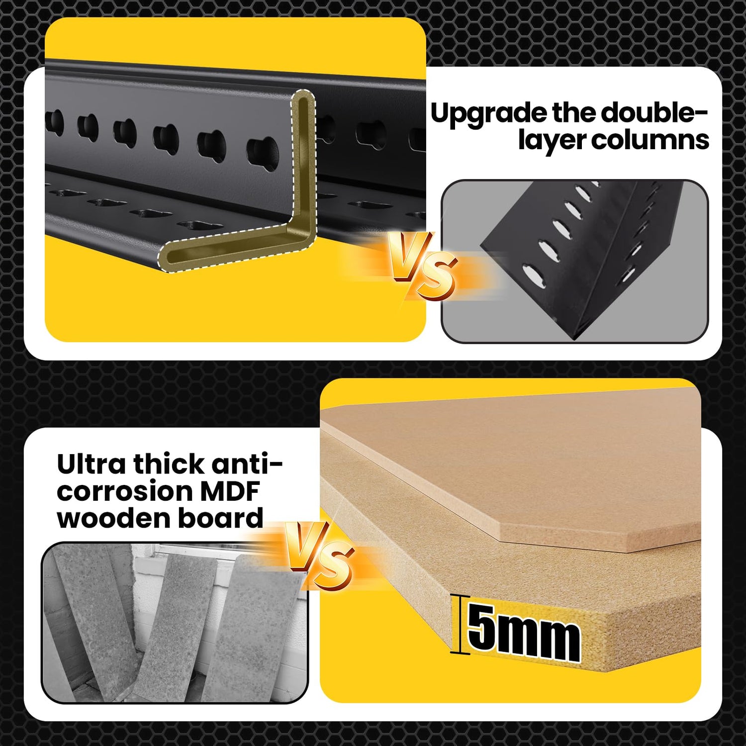 • 【2500-pound ultra-strong load capacity】In modern factory, we use professional mechanized equipment to manufacture double-layer column garage shelving that are 7 mm thick and 2 inches wide, with a load capacity far exceeding that of ordinary shelves. The surface of the metal columns is treated with a nano-level powder high-temperature curing spray coating process to form a 0.3 mm ultra-dense anti-rust and anti-scratch coating that can withstand the harshest garage environments.