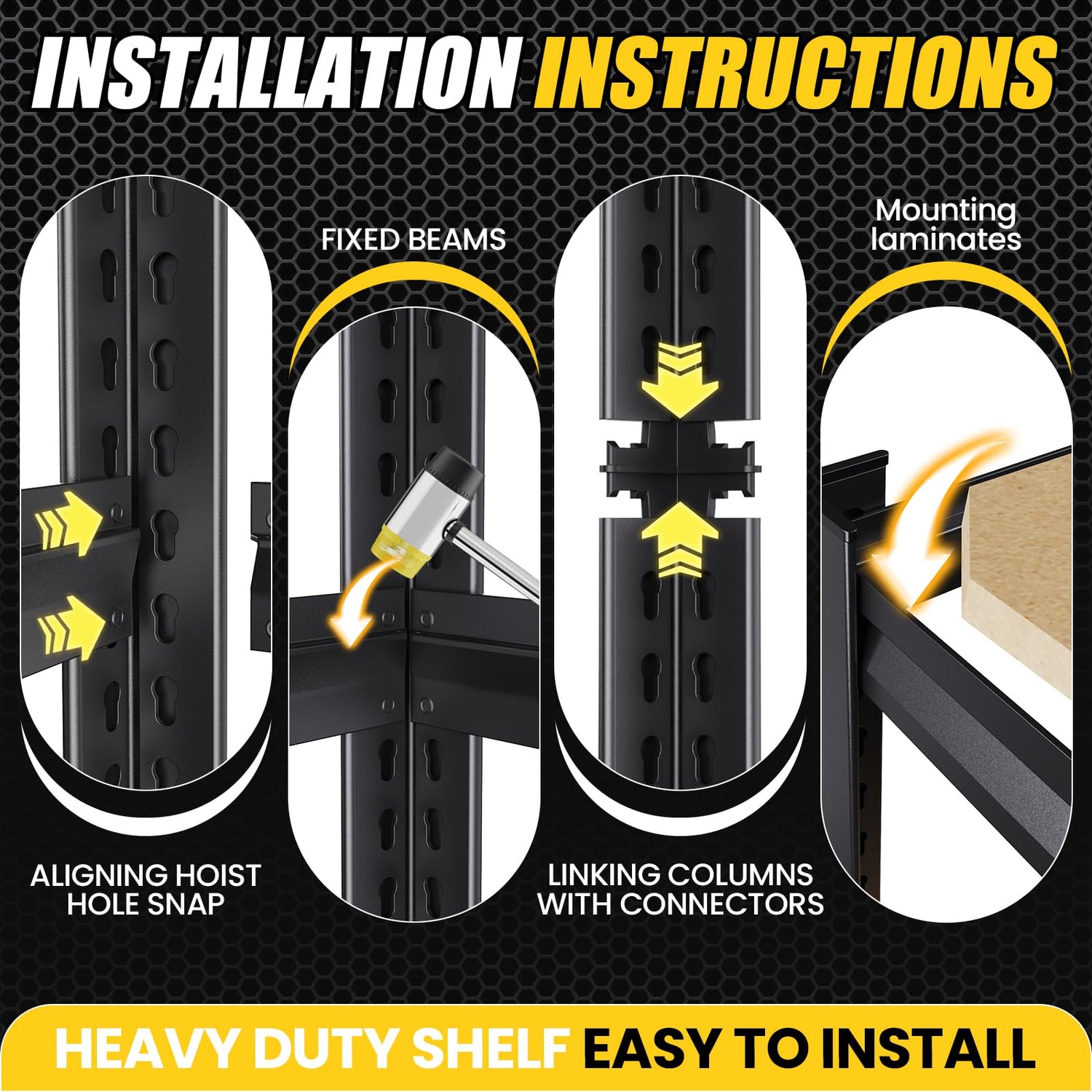 • 【Quick Installation】The metal garage shelving requires no screws for assembly. The columns and beams feature precision alignment grooves, allowing them to snap into place like building blocks. Simply use the included silicone hammer to gently tap and secure them in place. The garage shelving can be assembled in just 10 minutes, even by the elderly. When disassembling, simply pull gently to separate the pieces. Whether organizing your garage on the weekend, moving, or storing items, it’s incredibly convenient. The assembly experience is as simple as playing with a puzzle!