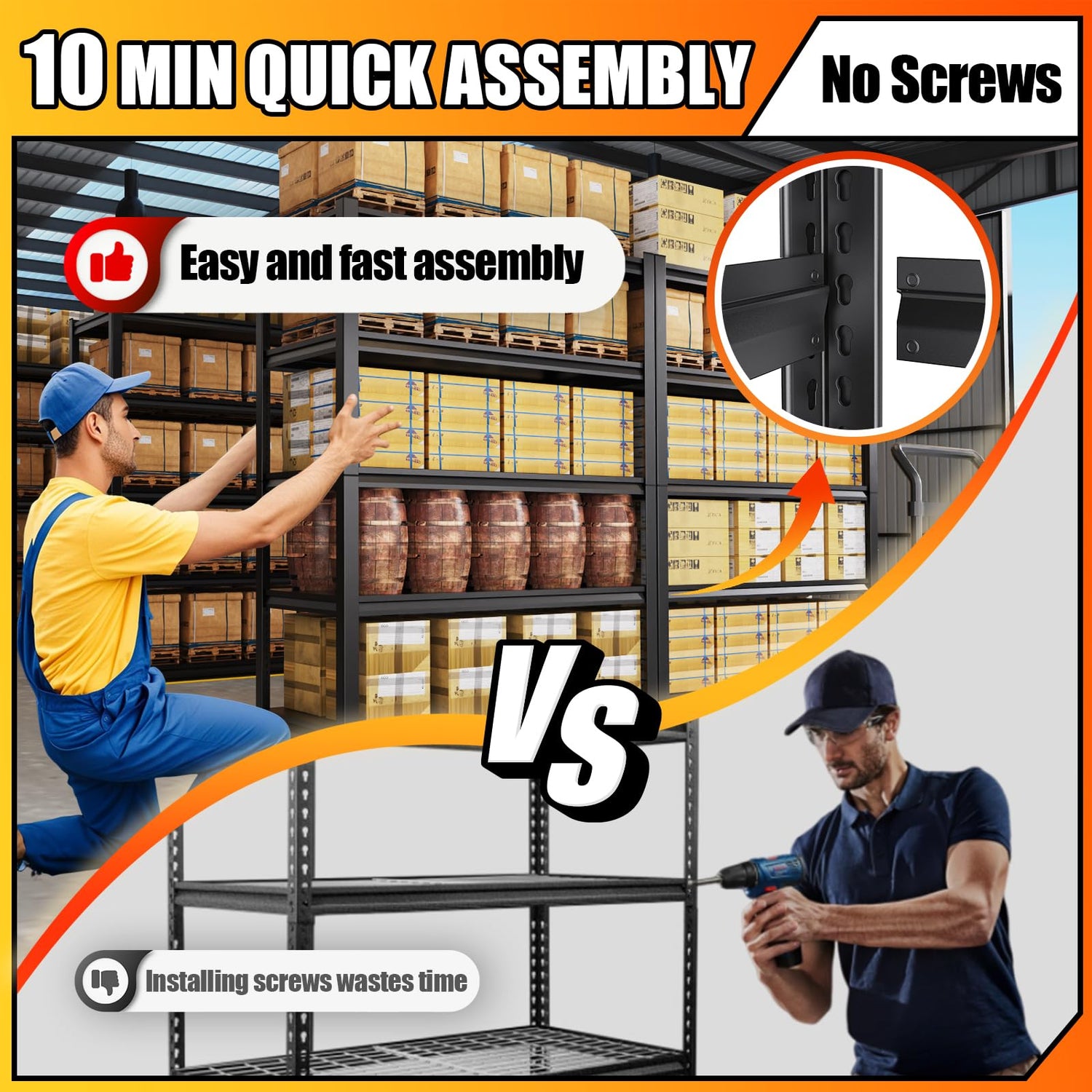 • 【Easy Assembly】The garage storage shelves uses a boltless interlocking design. No nuts and bolts are needed, just use the complimentary gloves and a small hammer to align the prefabricated connectors and then gently whack them to make the parts tightly connected. Accompanied by detailed and easy-to-follow installation instructions, people with no previous installation experience can easily complete the assembly in a cup of coffee time. An efficient storage solution for you.