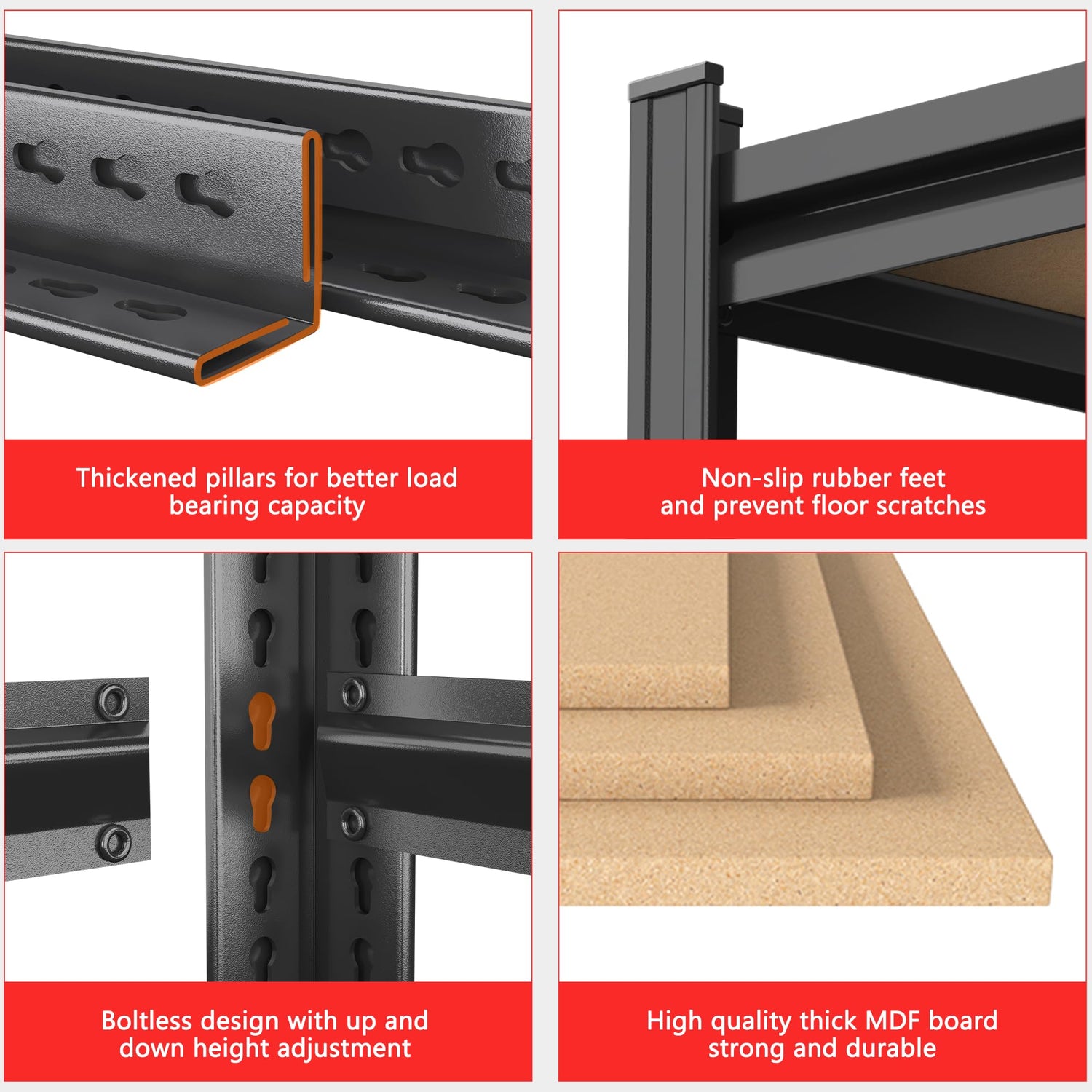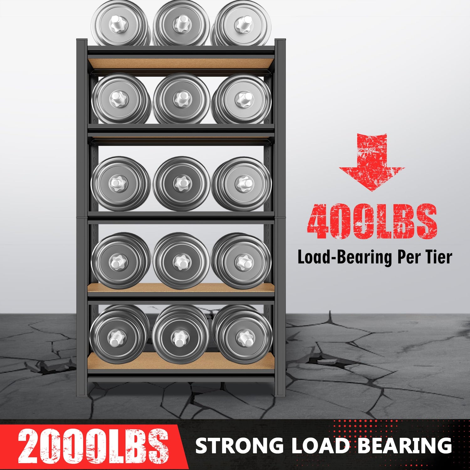 - 【Robust Industrial Warehouse Racking System】- The 5-tier robust industrial warehouse racking system boasts a construction of high-density particleboard panels and a robust steel framework with a superior epoxy resin coating. Each tier can support up to 400 lbs, translating to a collective maximum capacity of 2000 lbs for the 5 tiers.