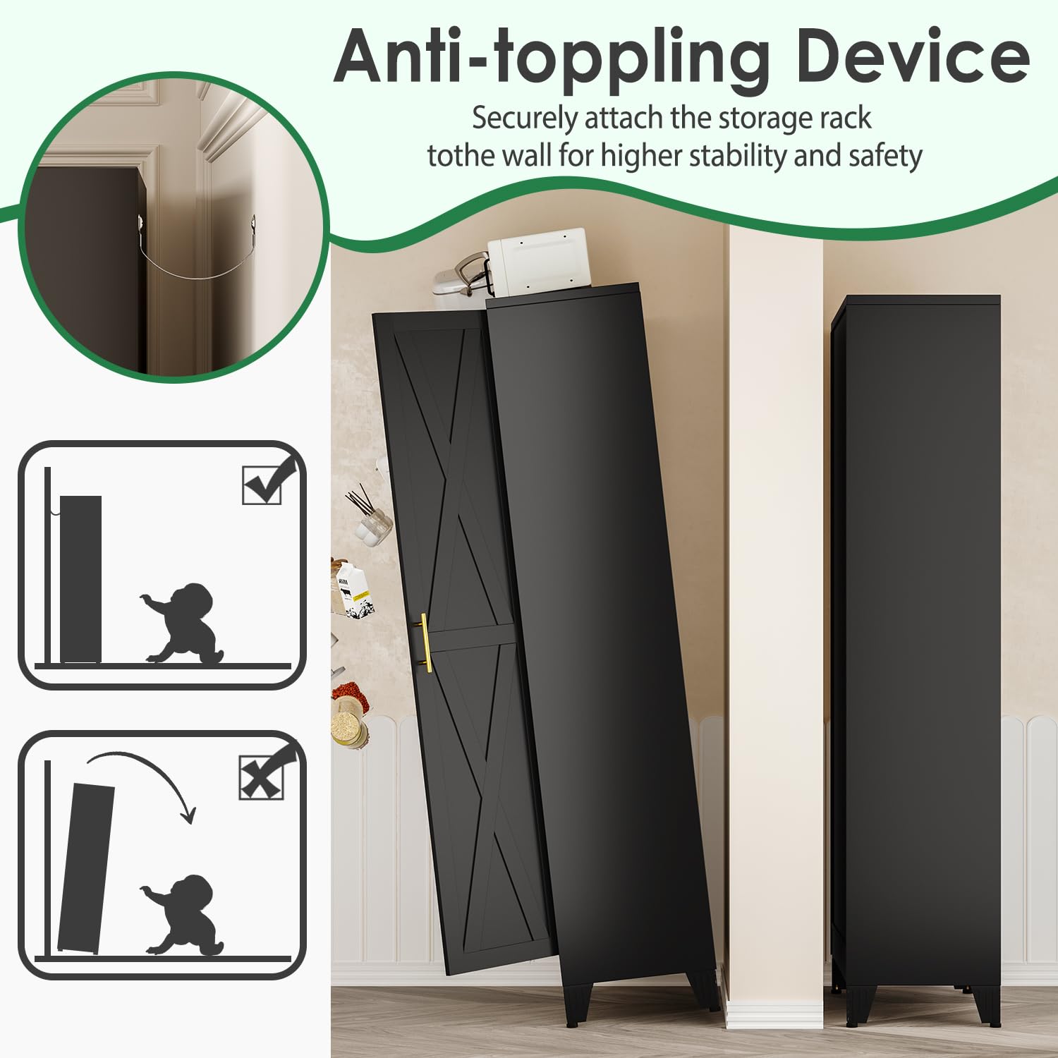 - 【MULTIFUNCTIONAL CABINET】: Black tall cabinet have sleek look and simple decorative lines add a sense of elegance. which you can use for pantry cabinet, food cabinet, kitchen cabinet, kitchen cupboard, utility cabinet, laundry room cabinets, bathroom cabinet, bedroom wardrobe, tool cabinet, file cabinet, etc. It will be your good choice for storage and organization.