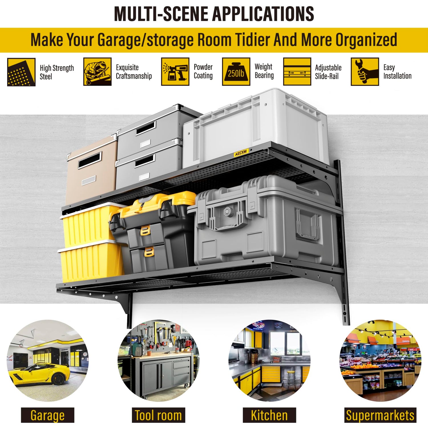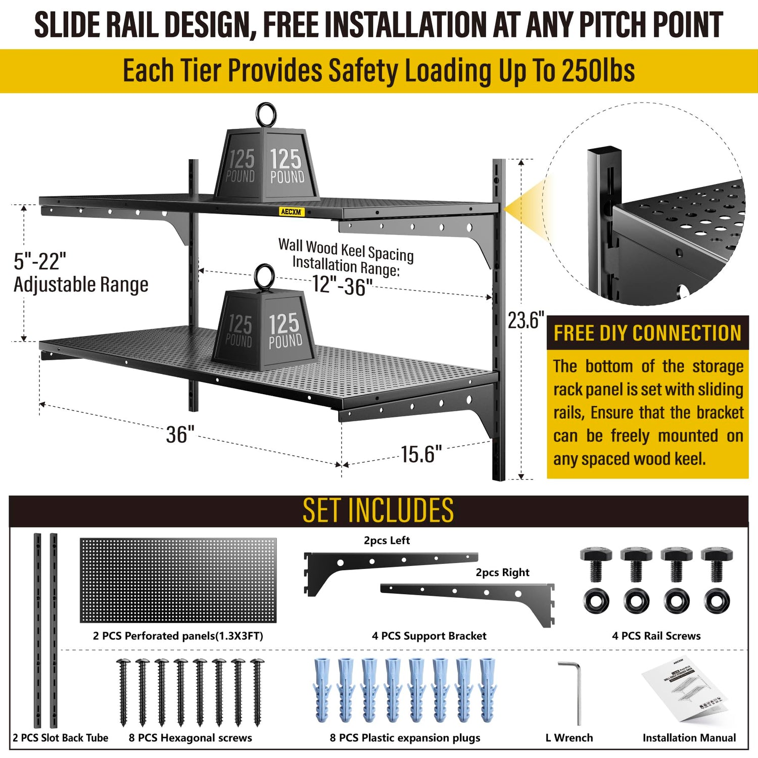 - Easy Installation: Easy solo installation with all hardware included. This adjustable garage shelf features slotted rectangular tubes for support, allowing panels to slide and lock at your desired height—simply place the shelf into the wall-mounted slots