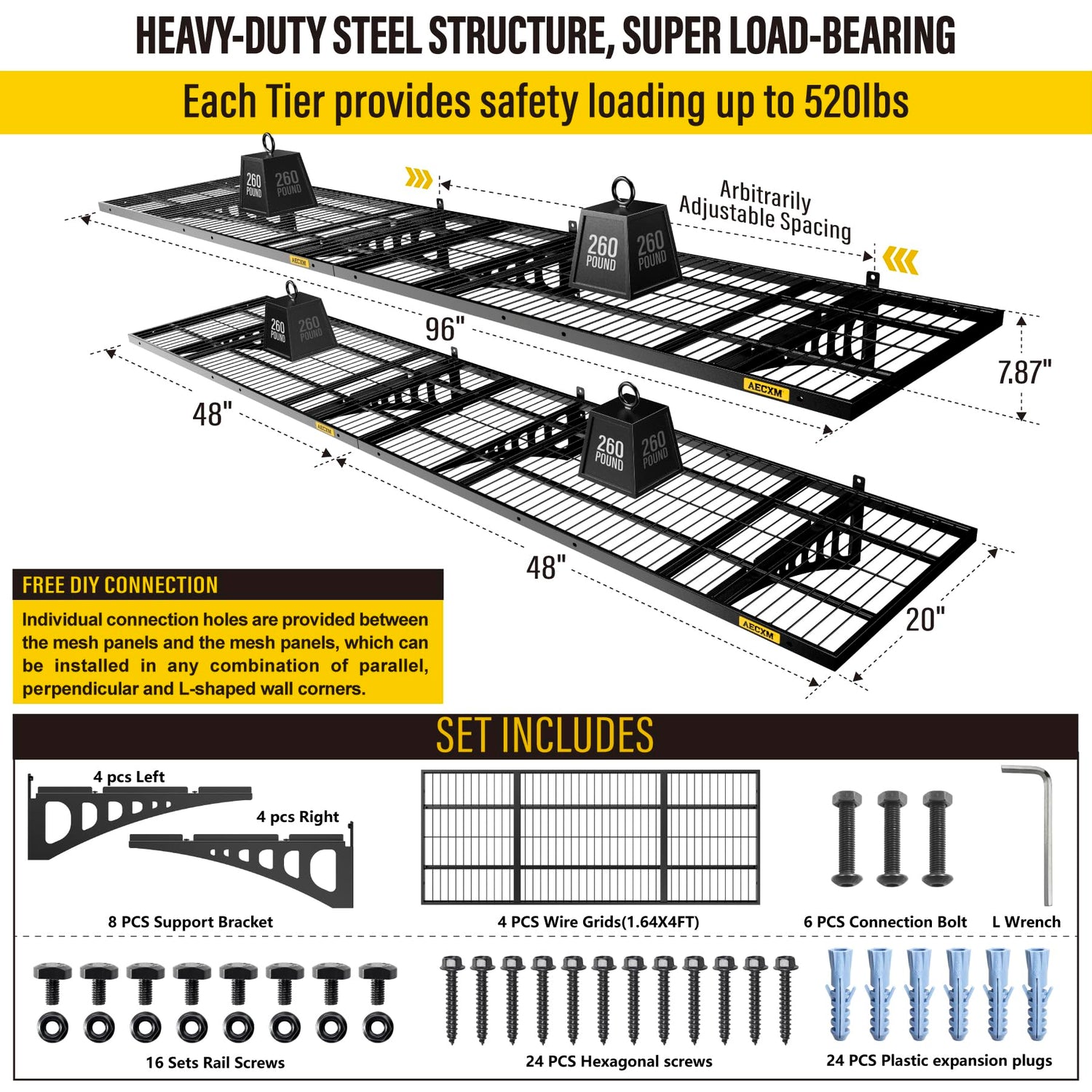 - INNOVATIVE UPGRADED DESIGN: Wall garage storage shelf is made of rectangular tube frame structure combined with thick iron wire mesh welding, The bottom of the panel is set with two sliding rails, Which not only makes the heavy performance of the storage rack stronger, But also the sliding rail design abandons the traditional fixed-point installation, And the two supporting brackets at both ends can be installed on the wood wall keel within the range of 8"-45" to connect with the panel precisely, And there will not be any problem that can't be connected due to mismatch of the wood wall keel spacing or inaccuracy of the brackets' installation, Which saves your time and labor