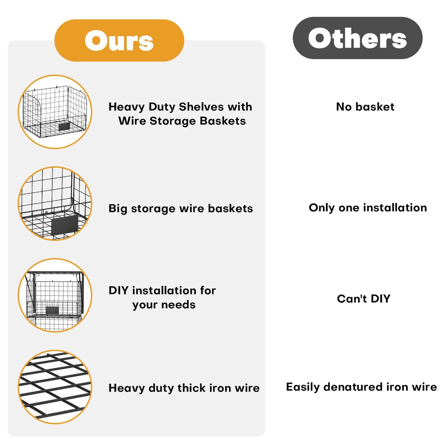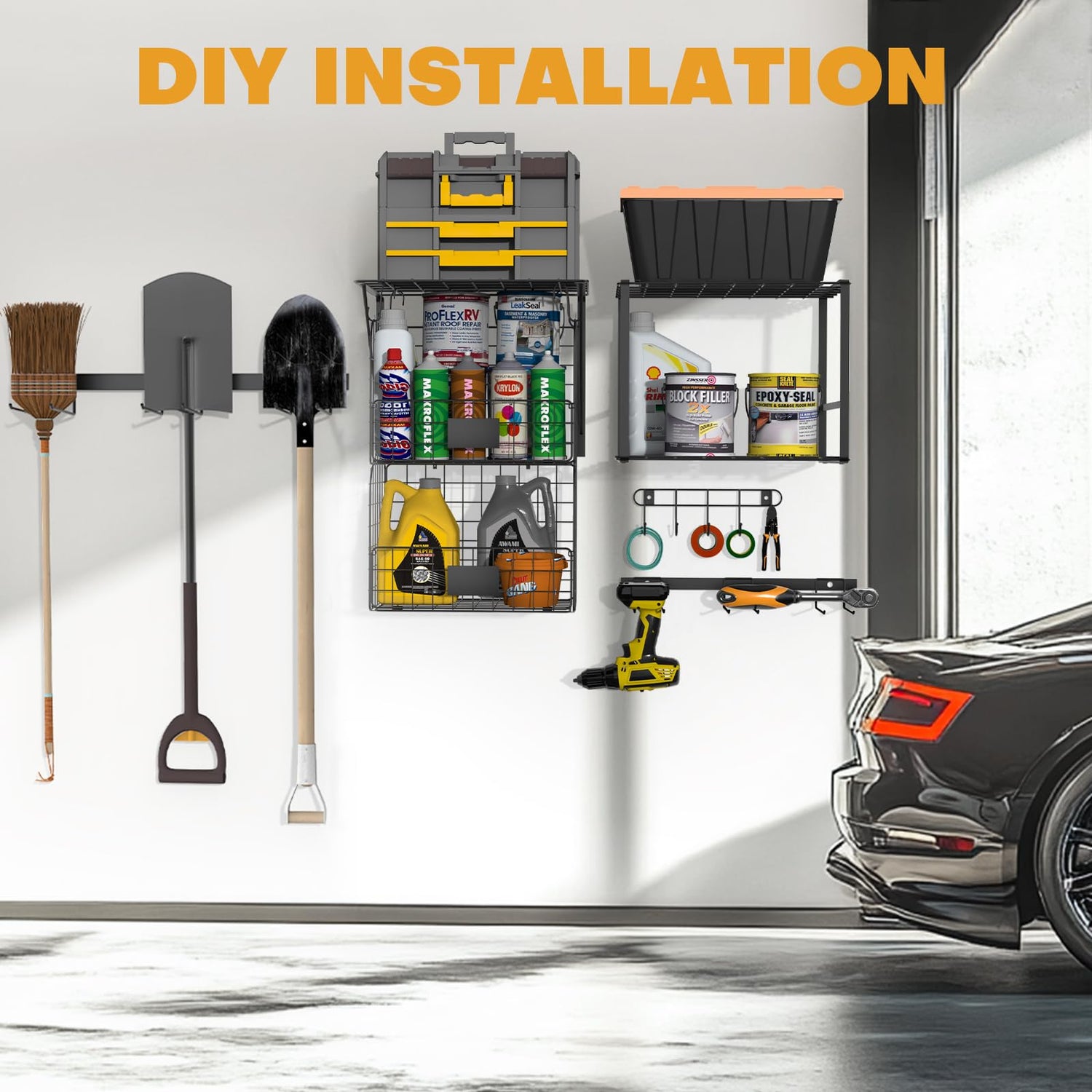• DIY Installation: Our 2024 upgraded heavy duty garage shelves fixtures are designed for easy DIY installation. Configure the shelves, baskets, and racks to meet your specific space needs. Whether you choose to interlock the baskets or hang them separately, this set offers maximum flexibility for your garage, workshop, yard, or garden storage needs.