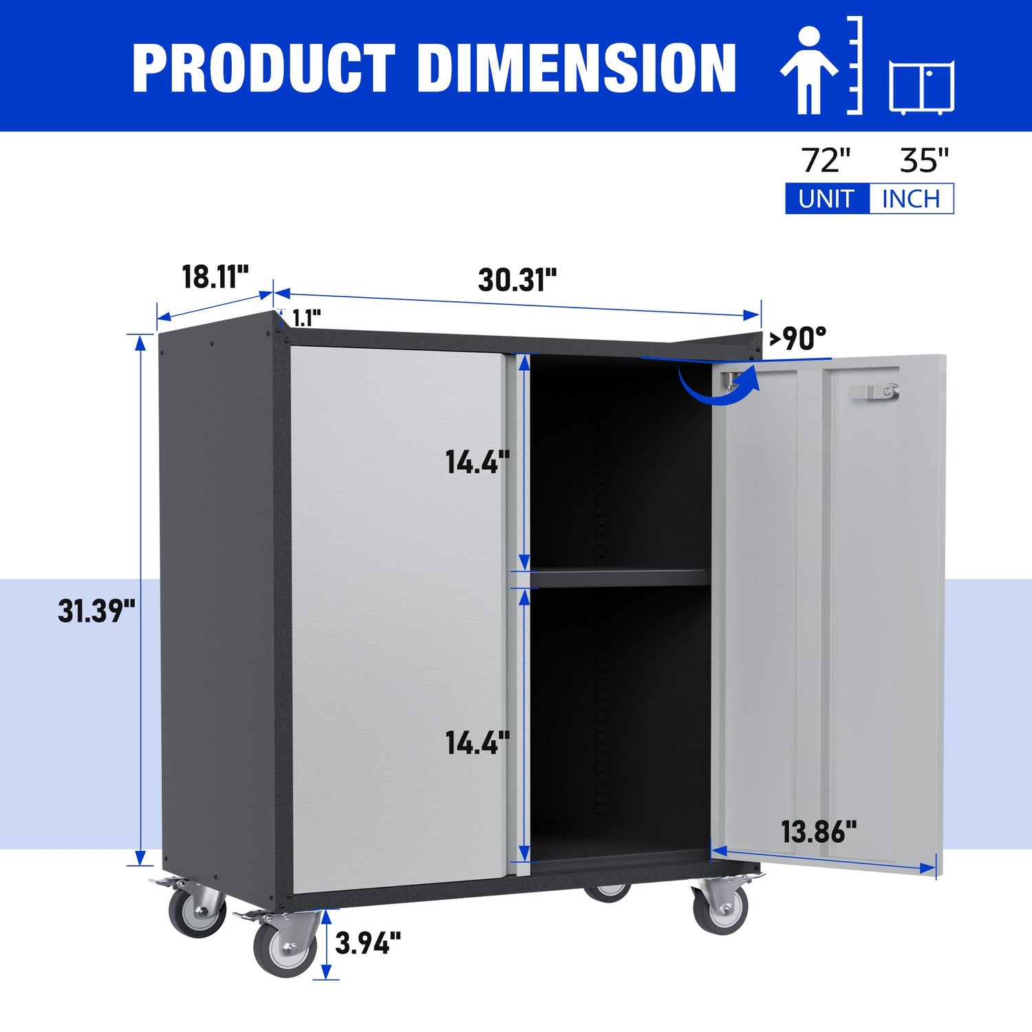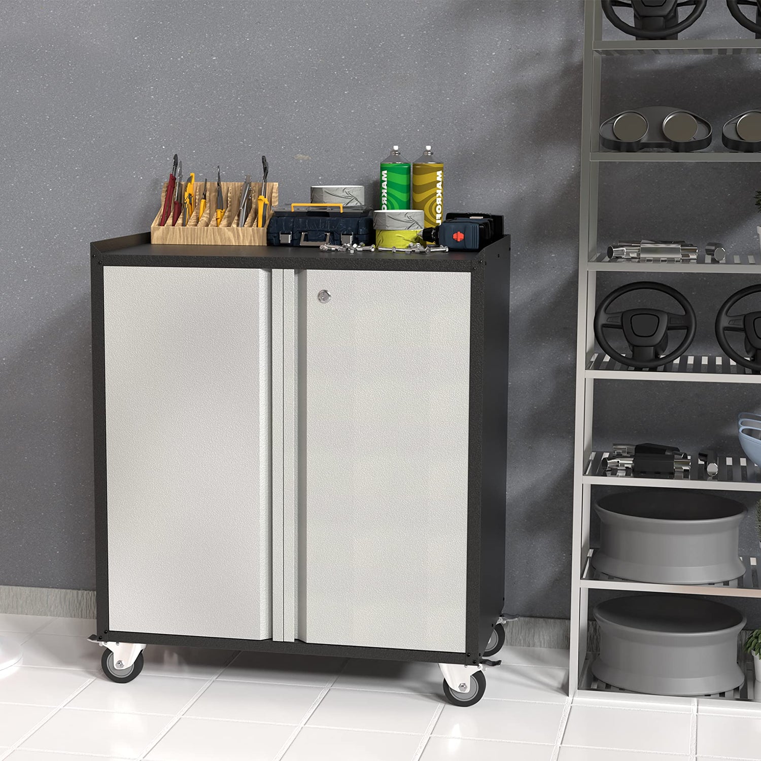 Aobabo 2 Door Tool Cabinets for Garage, 35.4 Inches Lockable Garage Storage Cabinet, Locking Metal Storage Cabinet with Wheels, Rolling Tool Chest, Assembly Required, Black/Gray