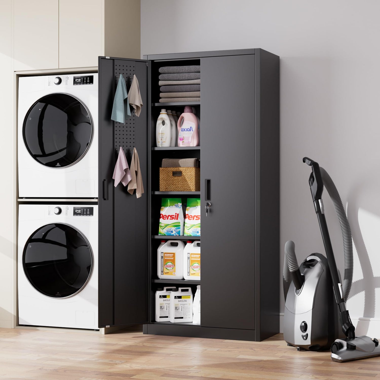 Aobabo 71" H×32" W×16" D Metal Storage Cabinet with 5 Adjustable Shelves, Locking Garage Storage Cabinet with Pegboards and 4 Hooks for Garage, Office, Black, Assembly Required