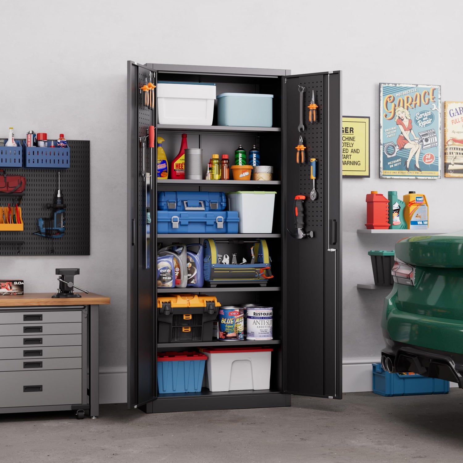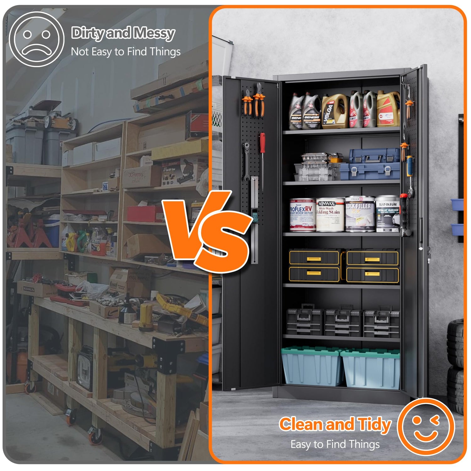 - 5 Shelves and 4 Hooks:The black 71 "H garage storage cabinets features five adjustable partitions. The door is equipped with pegboards, allowing for the hanging of four hooks to hold tools, clothes, and more. Meeting different usage requirements