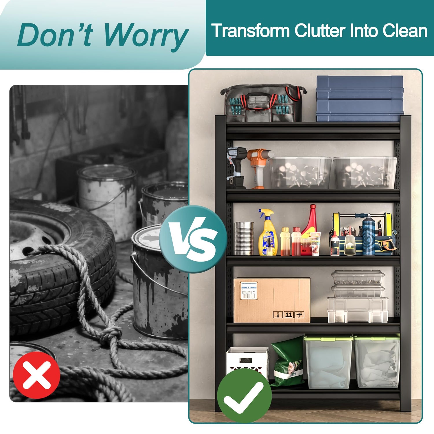 BESFUR 5-Tier Wider Garage Storage Shelves, Heavy Duty Metal Shelving Unit, Adjustable Matal Storage Shelving, 3000 lbs Capacity, for Warehouse Garage Basement, 19.7" D*47.3" W*71" H, Black