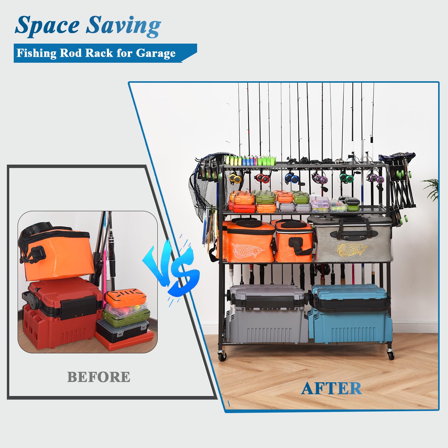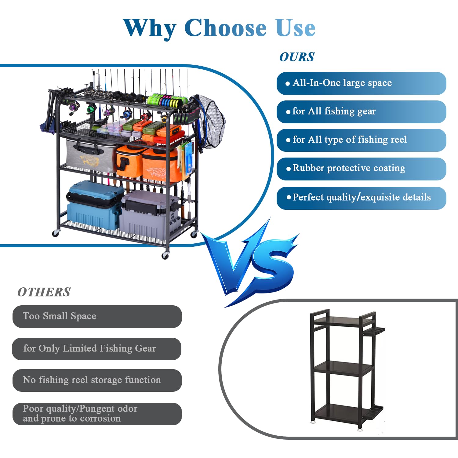 • Fishing Rod Protection/Large Wheels: Soft PVC Coating of back fishing rod rack baffle, rubber-covered to protect the fishing rod rack from scratches; 4 wheels makes the fishing gear storage easy to move, and two brake wheels allow it to be fixed in the position you want