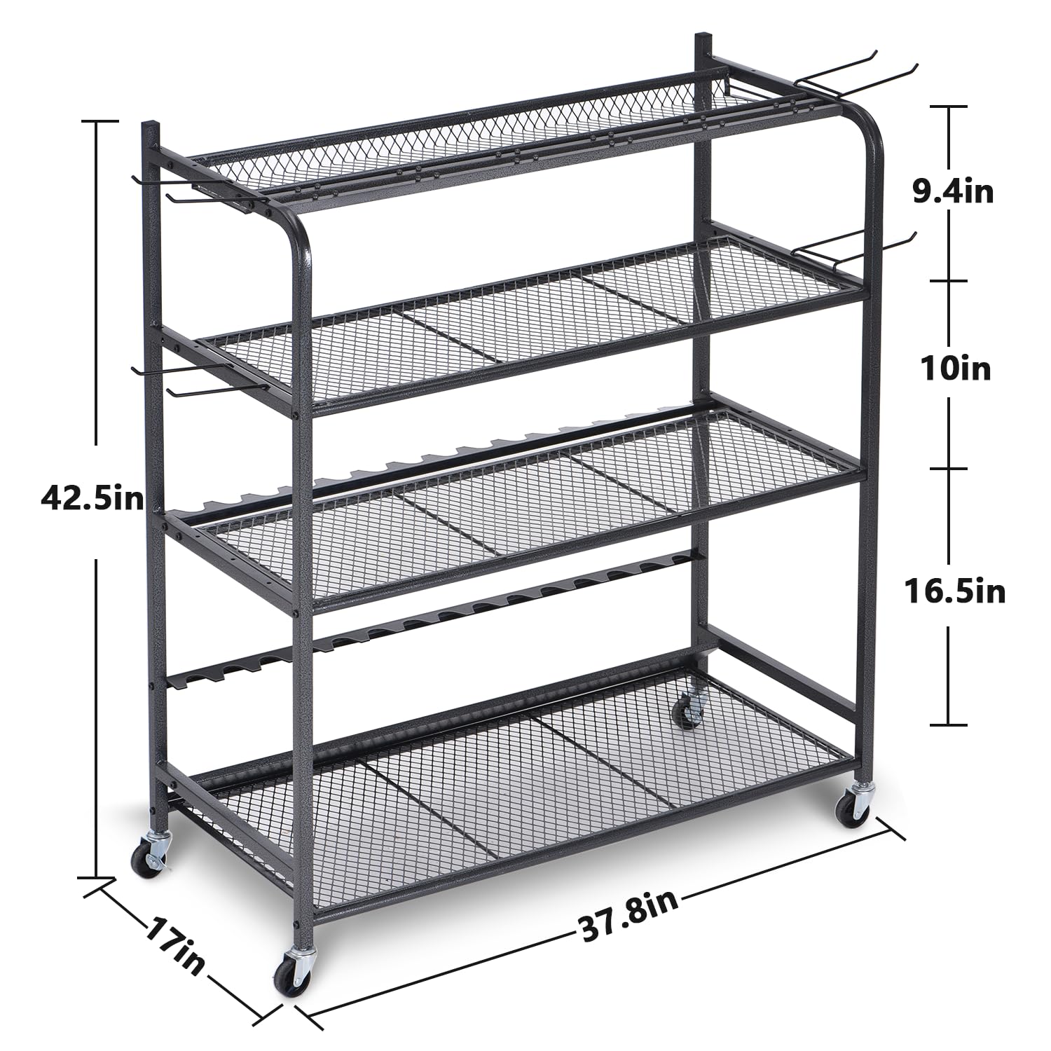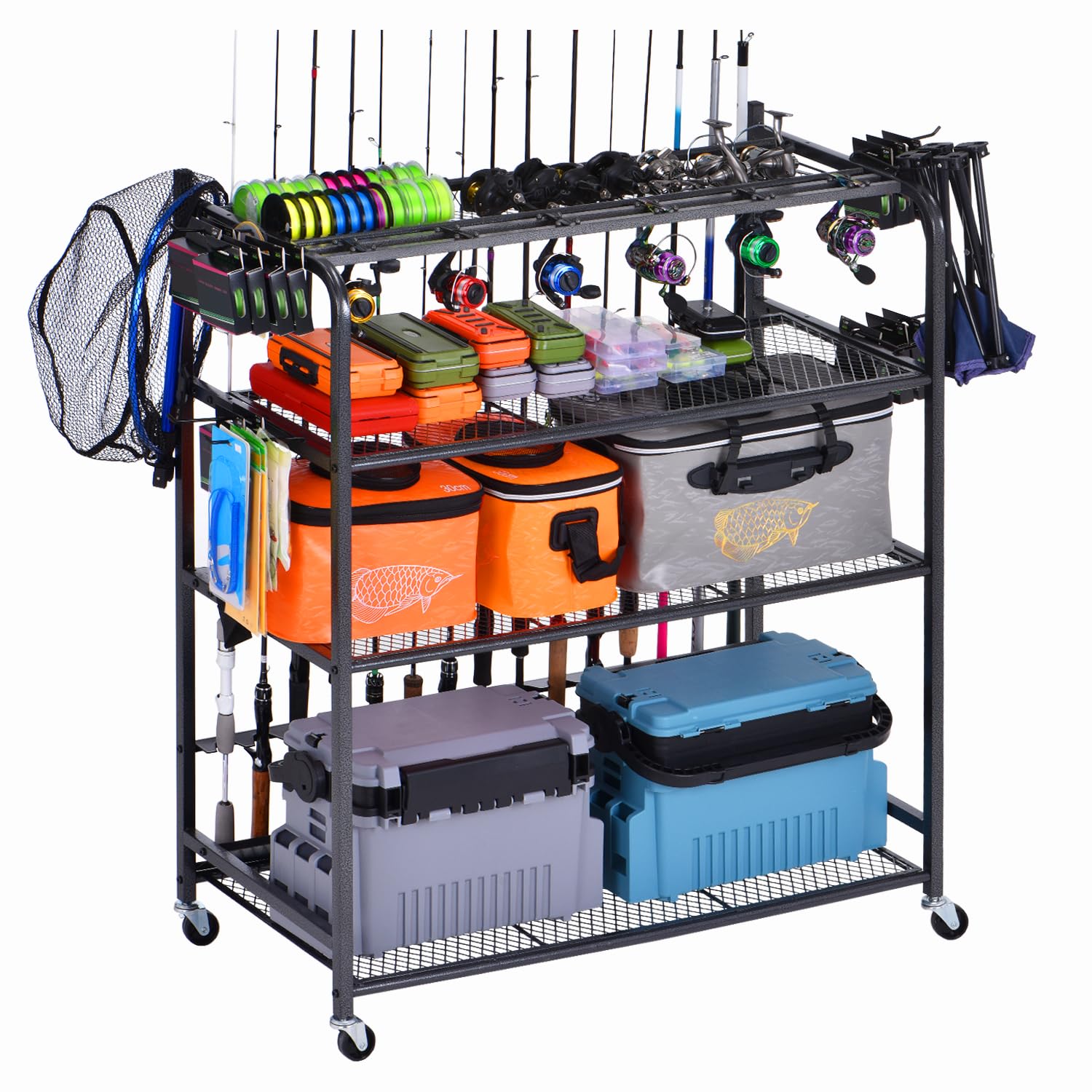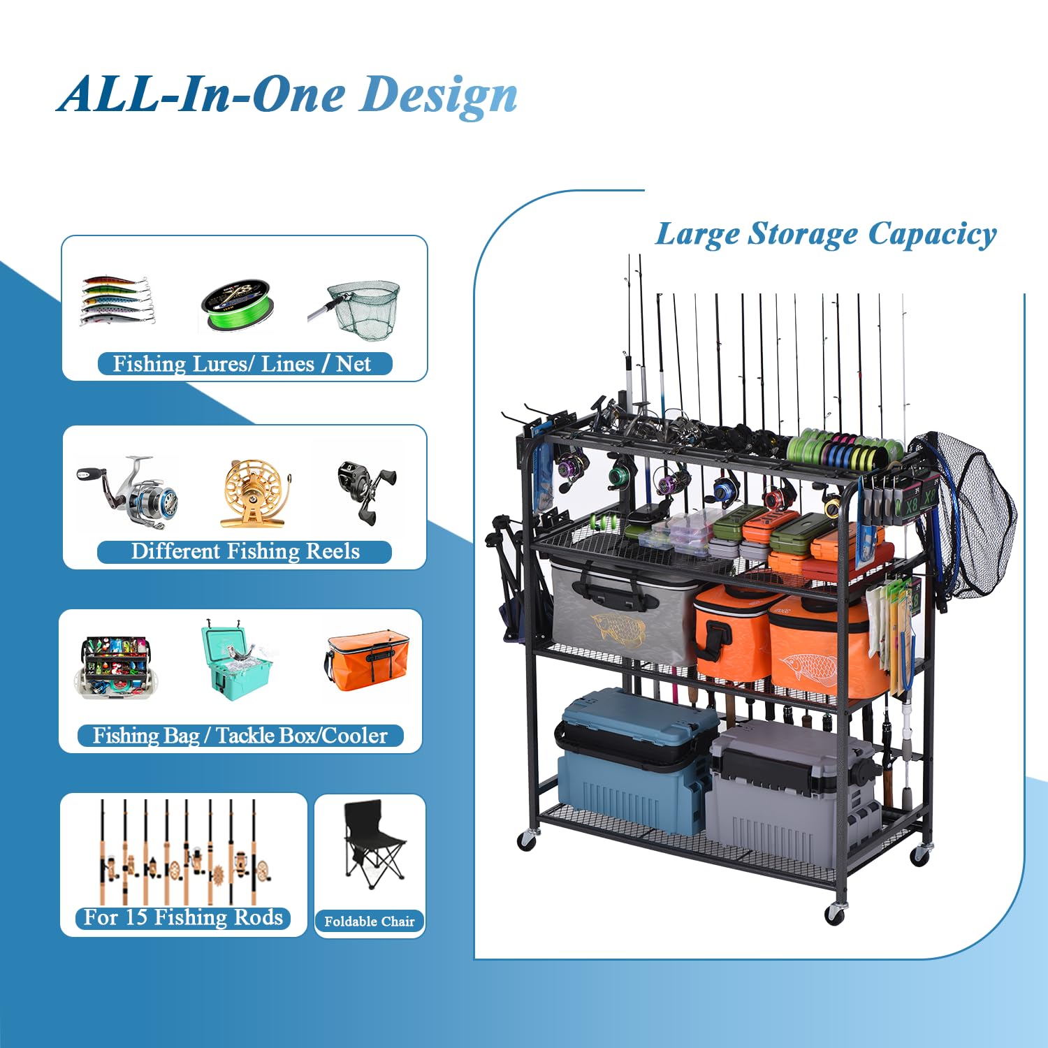 Bknius Fishing Rod Holder for Garage for 15 Rods, Fishing Pole Holders for Fishing Gear Storage Organizer, Fish Rod Rack Basement, Metal Black with Big Wheels, 4-Tier