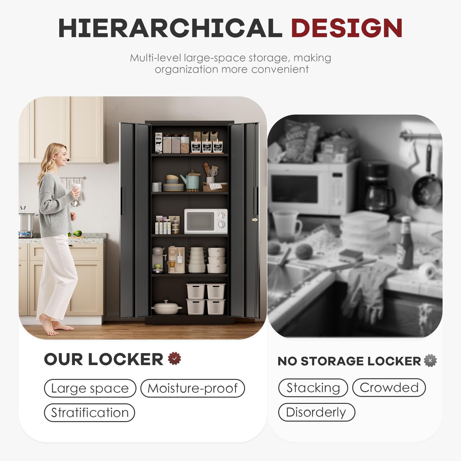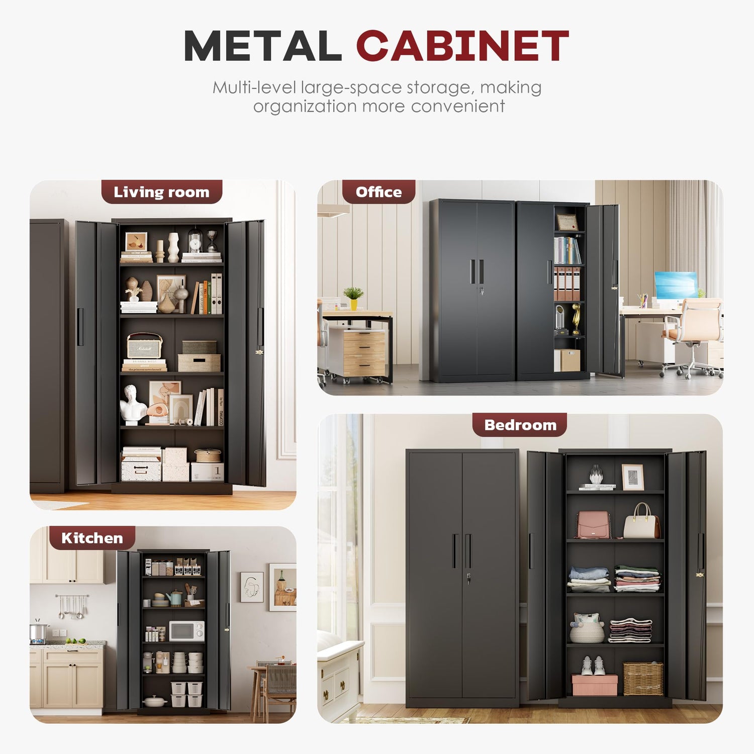 - 【4 Adjustable Shelves (5 Storage Tiers)】Customizable Space-Rearrange 4 shelves in this locking storage cabinet to fit tools, files, or pantry items of any size.180lbs Weight Capacity per Shelf- Holds heavy tools, documents, or kitchen supplies securely.Reinforced Bottom Shelf -Supports extra weight (up to 200lbs) for bulky items.