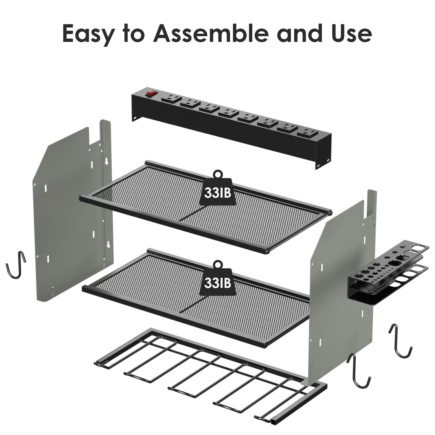 - Easy to assemble and mount on a peg board, If you need more storage space, you can connect the two shelves (or more) by screws. Each layer of the grid can support a maximum weight of 33IB. Made from heavy gauge steel.
