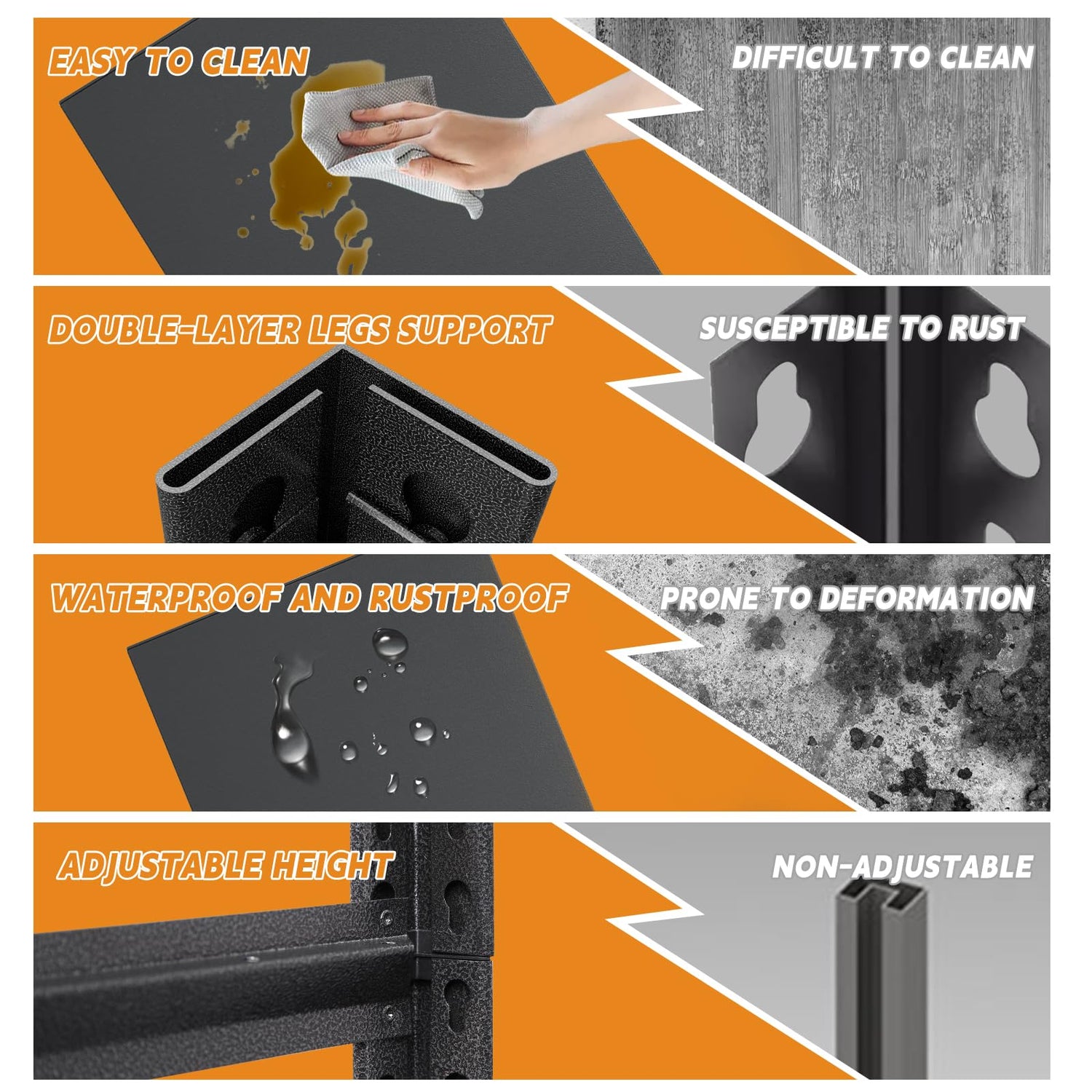 - 【Durable, Long lasting】The heavy duty shelving is made of high quality steel for stability and durability. Equipped with reinforcement on the bottom shelves, the high load capacity. A specially treated rust-resistant coating on the surface ensures that the shelves remain shiny even in wet environments