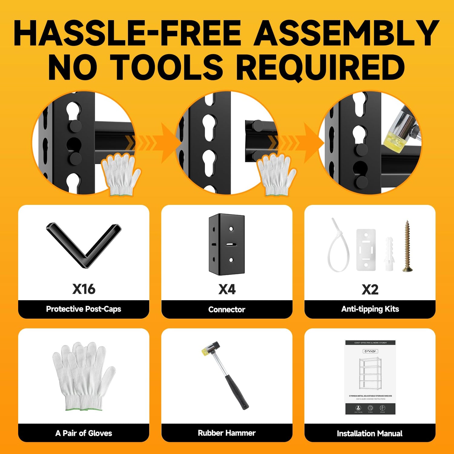 - Easy & User-friendly Assembly: Setting up is a breeze with our boltless design—no screws, nuts, or tools required! Included in the box: gloves, a rubber mallet, and a step-by-step manual with labeled parts. Simply slide the frame into place, secure the brackets, and give it a few gentle taps with a mallet to assemble a sturdy garage shelf.