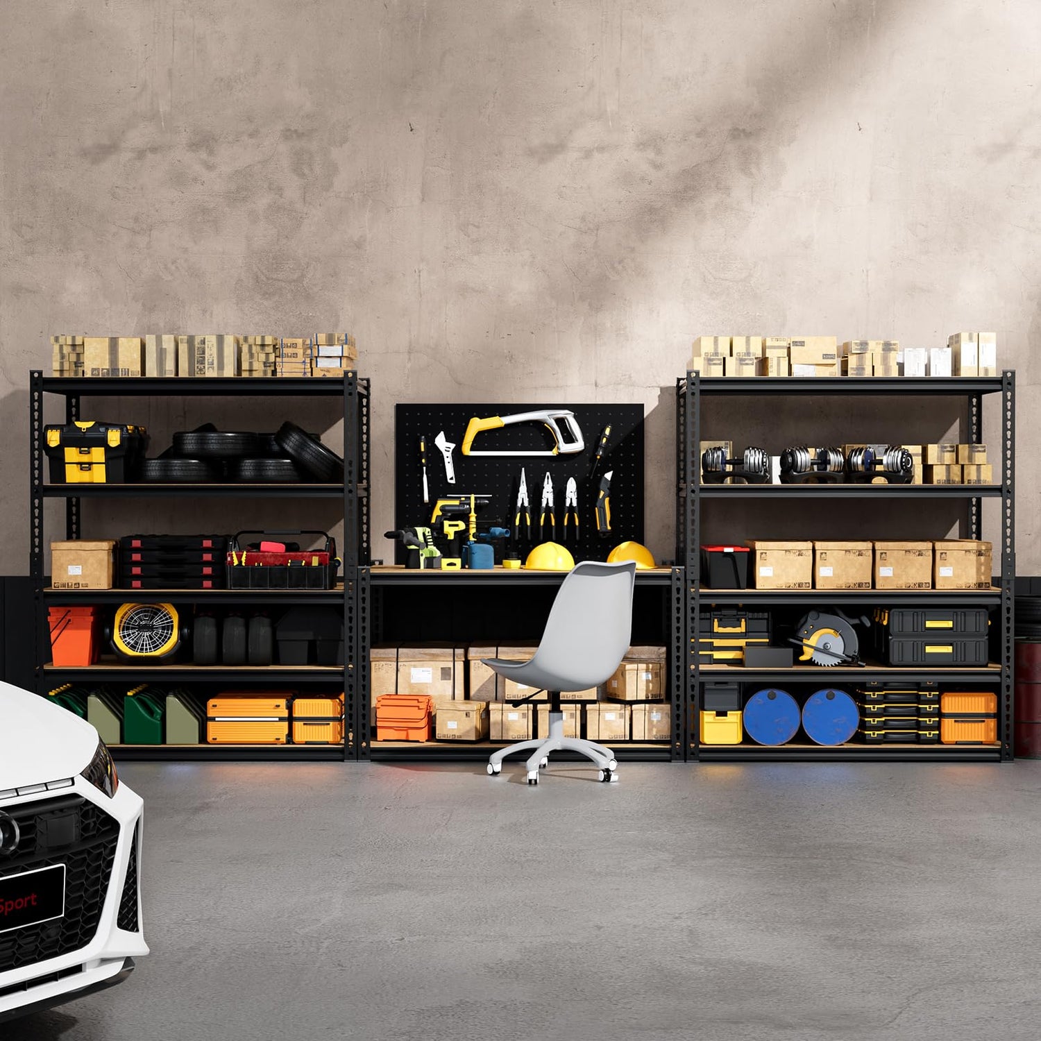 - 2500LBS Garage Storage Shelves: Made from premium-grade steel, this heavy-duty shelving unit supports up to 2,500 lbs. It’s perfect for storing bulky toolboxes, automotive gear, and seasonal items—keeping your garage organized with ease.