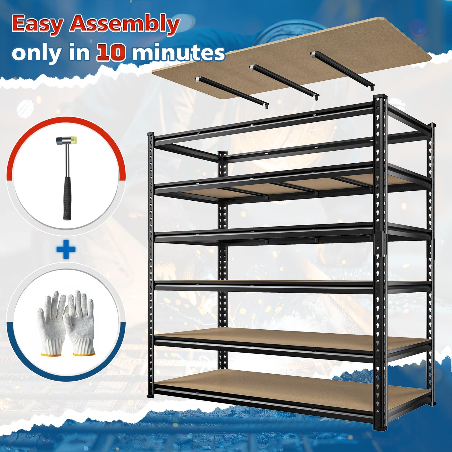 - 【Easy Assembly in 10 Minutes】 Within 10 minutes, this storage shelves heavy duty allows for quick assembly with its unique interlocking design. To ensure a smooth process, a hammer, a pair of gloves, and detailed specifications are provided