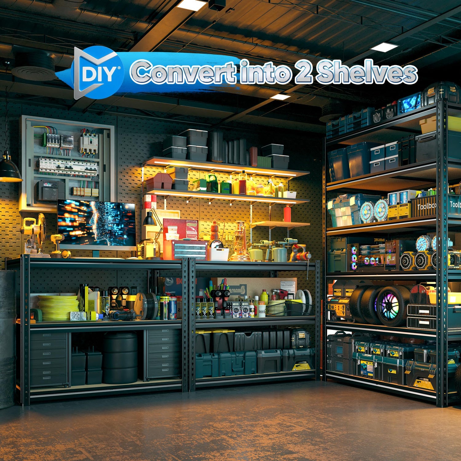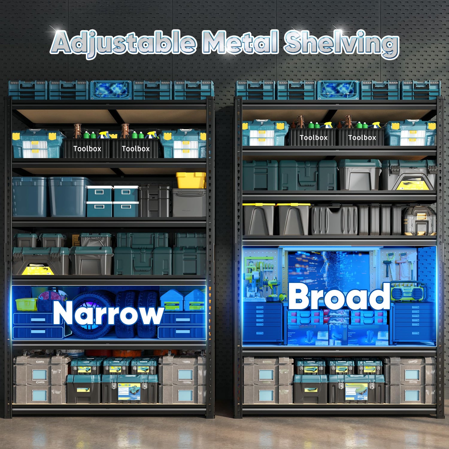 - 【Adjustable Garage Shelves】The height of this shelving unit is adjustable. You can move the shelves up and down to optimize space utilization and meet various storage needs. Additionally, it can be split into two separate units that function as workbenches
