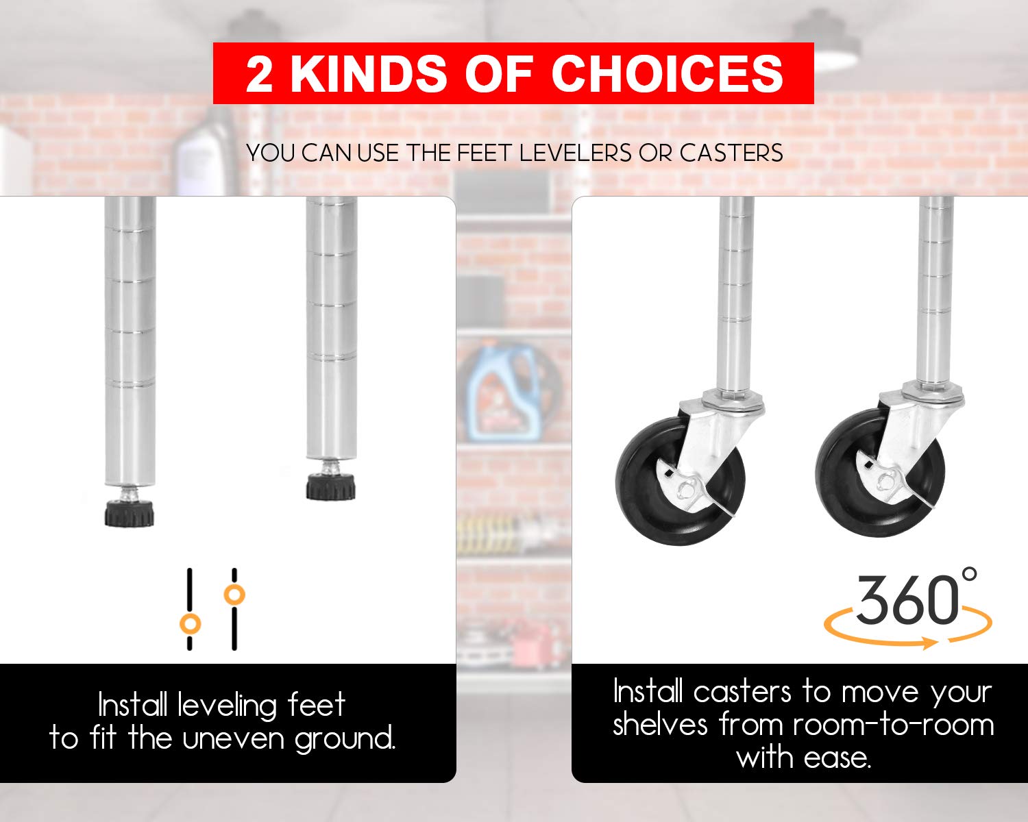 - ✔【Adjustable Height】 Enjoy a completely customizable metal commercial shelving unit. The build allows for height adjustments - giving you the freedom to adjust accordingly to your needs. Comes with easy adjustable clips to secure and stabilize each shelf. The multi-purpose shelf rack is perfect for garage shelving, kitchen storage, pantry shelving, and more.