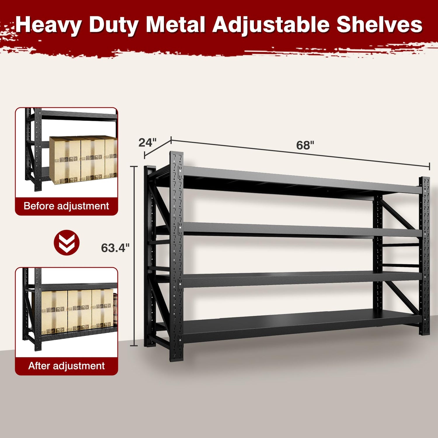 - 【68" W x 24" D x 63.4" H Extra Wide& Large Heavy Duty Shelving】 We have newly designed the load-bearing structure of this shelf and widened the metal shelves, making it suitable for use in outdoors, garages, warehouses, commercial spaces, storage rooms, kitchens, basements, offices, and other areas. The four-tier garage shelf not only expands your storage space but also helps maintain a tidy and organized living environment.