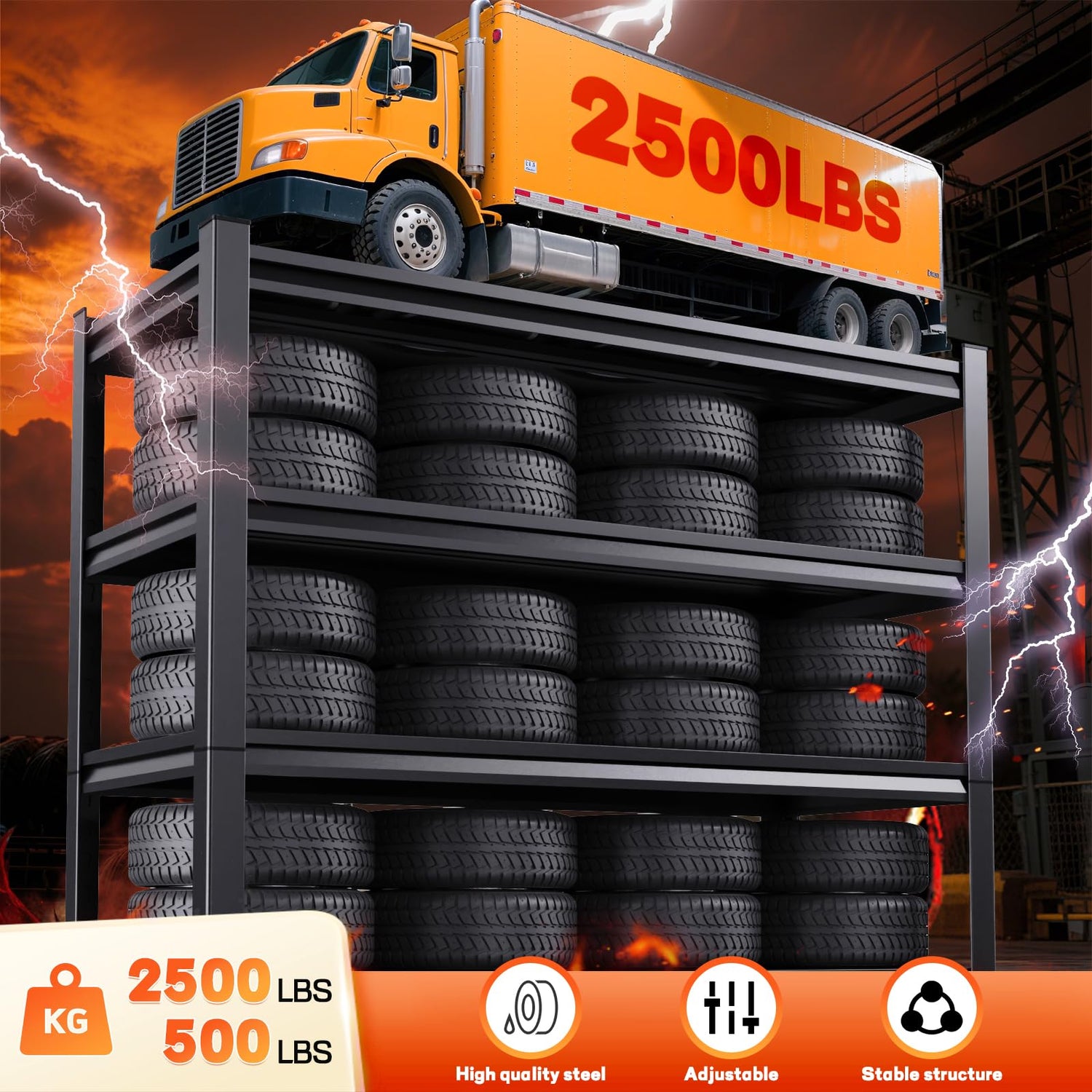 - 1.Sturdy and Durable: No more worrying about where to store your toolbox, oil drums, or camping gear in the garage! This 5-tier garage shelving unit can securely hold up to 500 pounds per shelf—equivalent to supporting two adult men simultaneously. Whether it's boxes filled with books at home or industrial equipment in a warehouse, the metal storage shelves provides stable support. You won't have to worry about items being too heavy causing the shelves to bend or break, ensuring reliable storage.