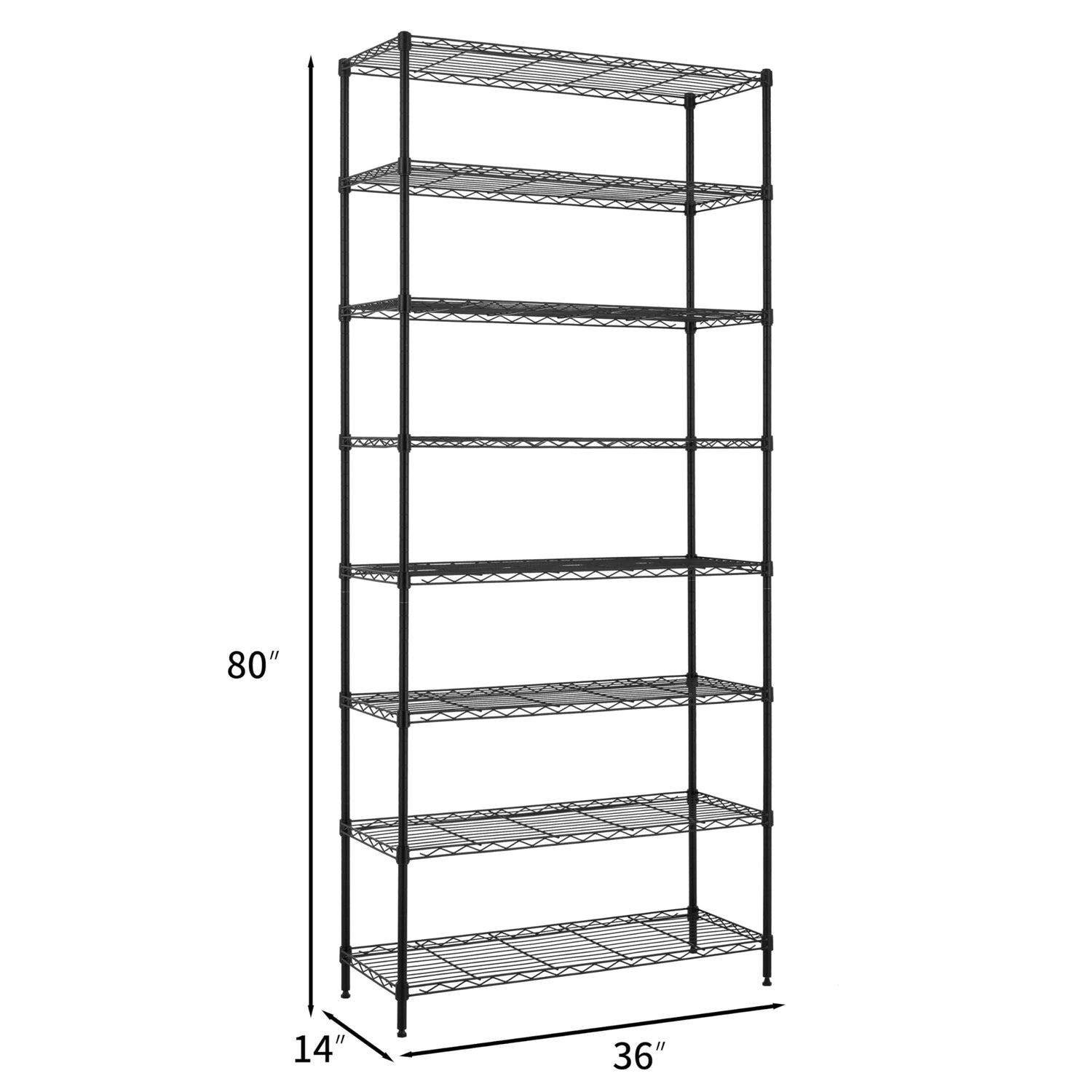 - UPDATE & OPTIMIZE - A lot of customers who bought our 8 tier wire shelving rack want to make the rack wider, so we have developed a new shelving unit which shelf size is 14x36 with 80 inches height and have 8 shelves, wider shelves and 80 inches tall rack can maximize your storage space and make your home storage more flexible. Let's diversified storage and easy access in kitchen, office, garage and more.