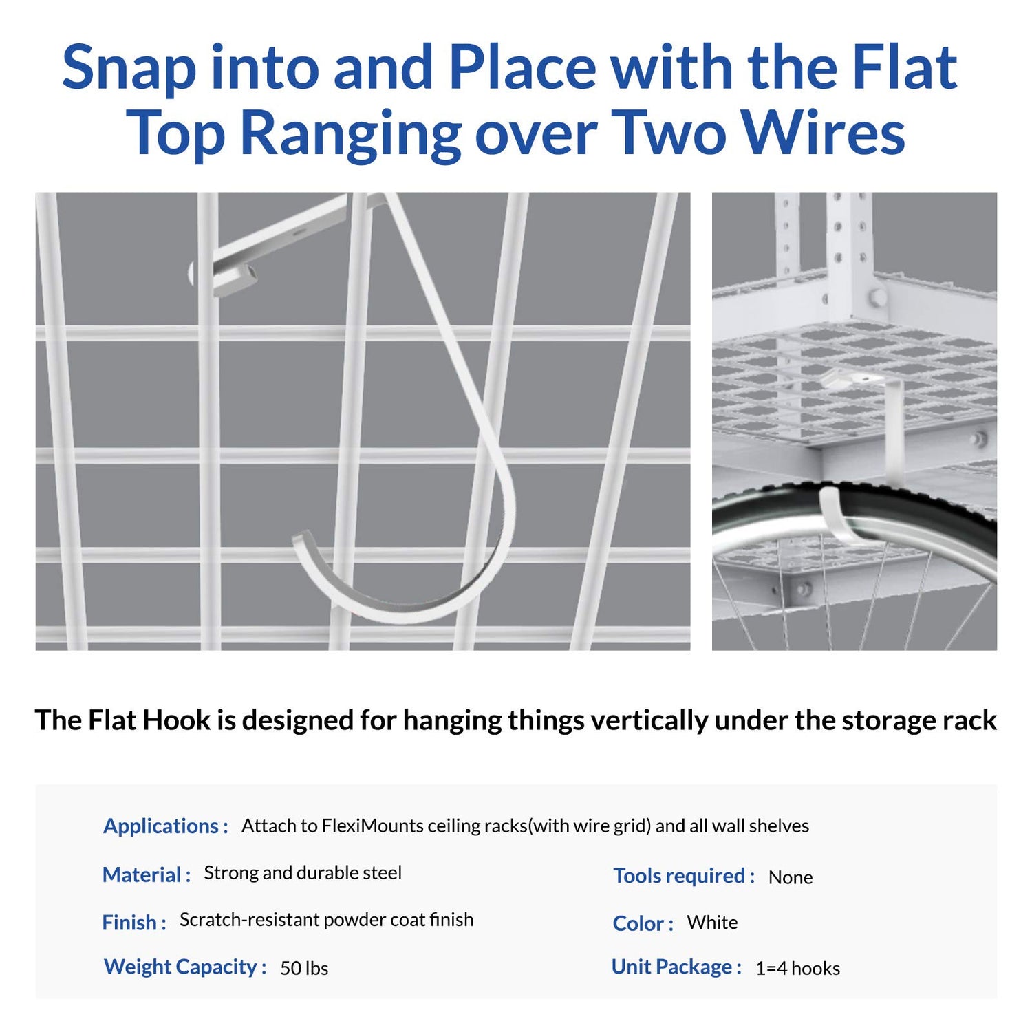 FLEXIMOUNTS 4 Pack Add On Storage Flat Hook Accessory for Garage Ceiling Rack and Wall Shelving, Max Weight Capacity up to 50lbs, White