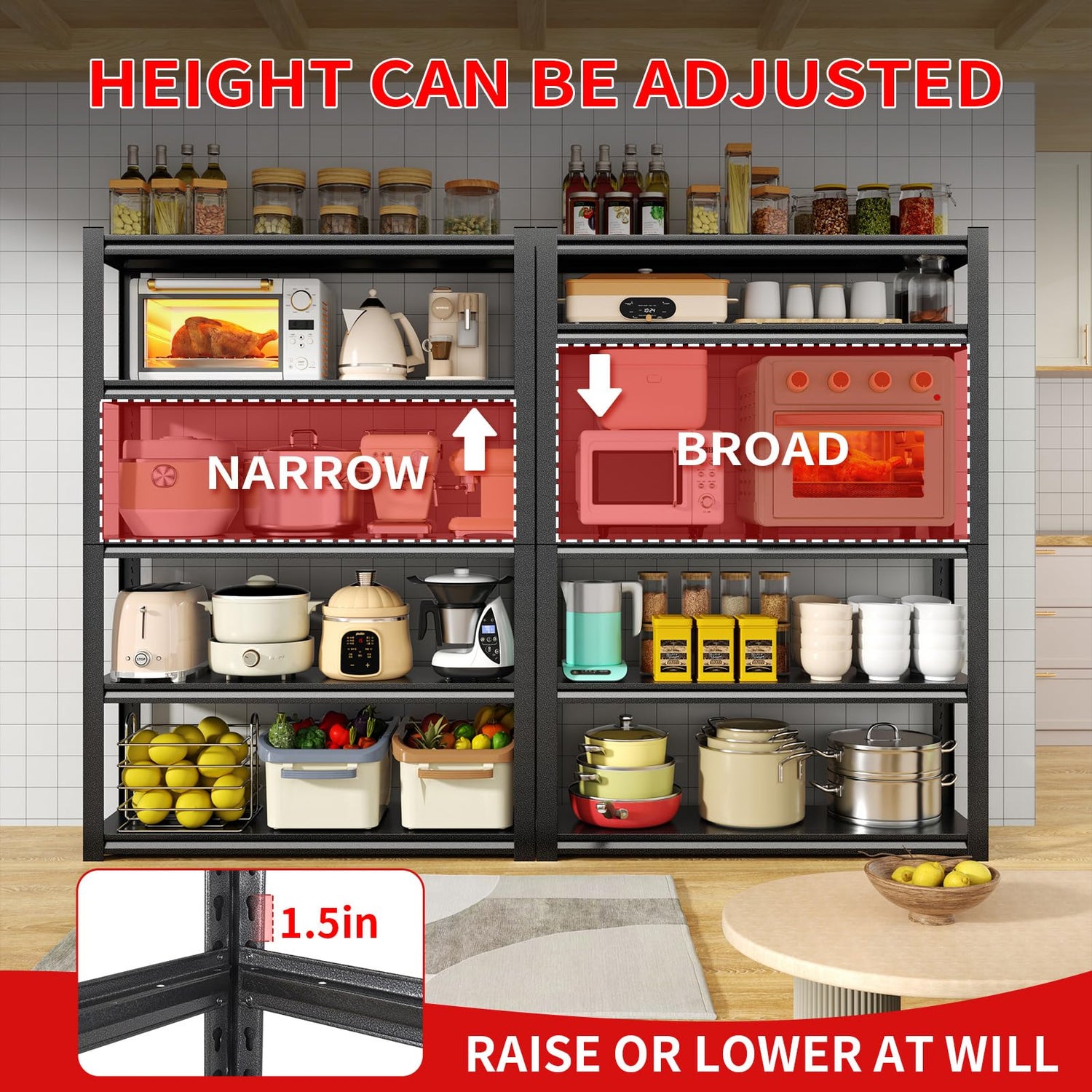 - Adjustable & Freely Convertible: The adjustable design of the metal shelving allows you to change the height of each tier to fit your items perfectly to be placed. You can also freely convert the 5 tier metal shelf into 2 shelf unit for flexible storage options.