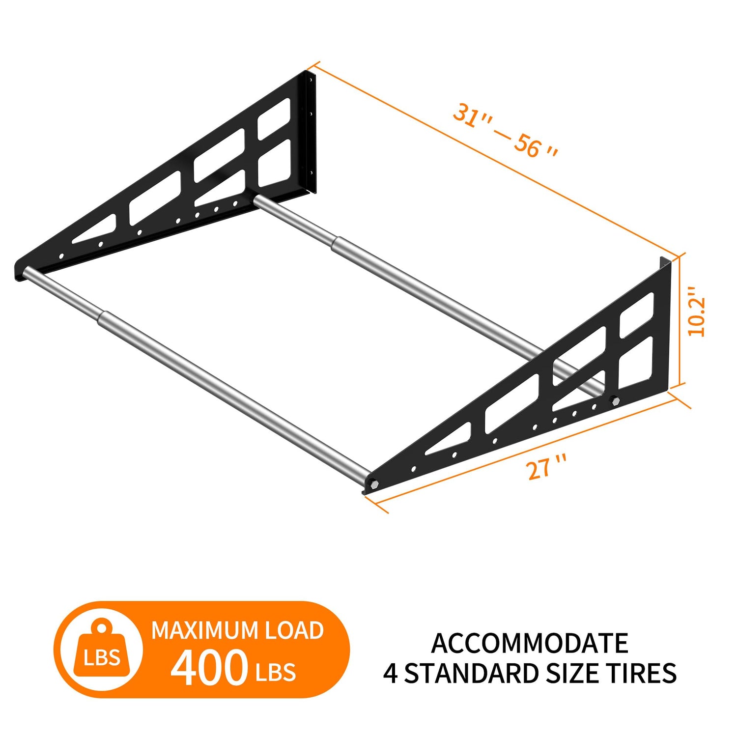 • High Quality Material RACKING SYSTEM: With a 400-pound maximum weight capacity, this wall mount rack features an ergonomic, heavy-duty 12-gauge telescoping steel tubing that extends up to 56 inches. Built to last, the adjustable mechanism reduces flexion and overall sag and easily add/store 4 tires above the ground.