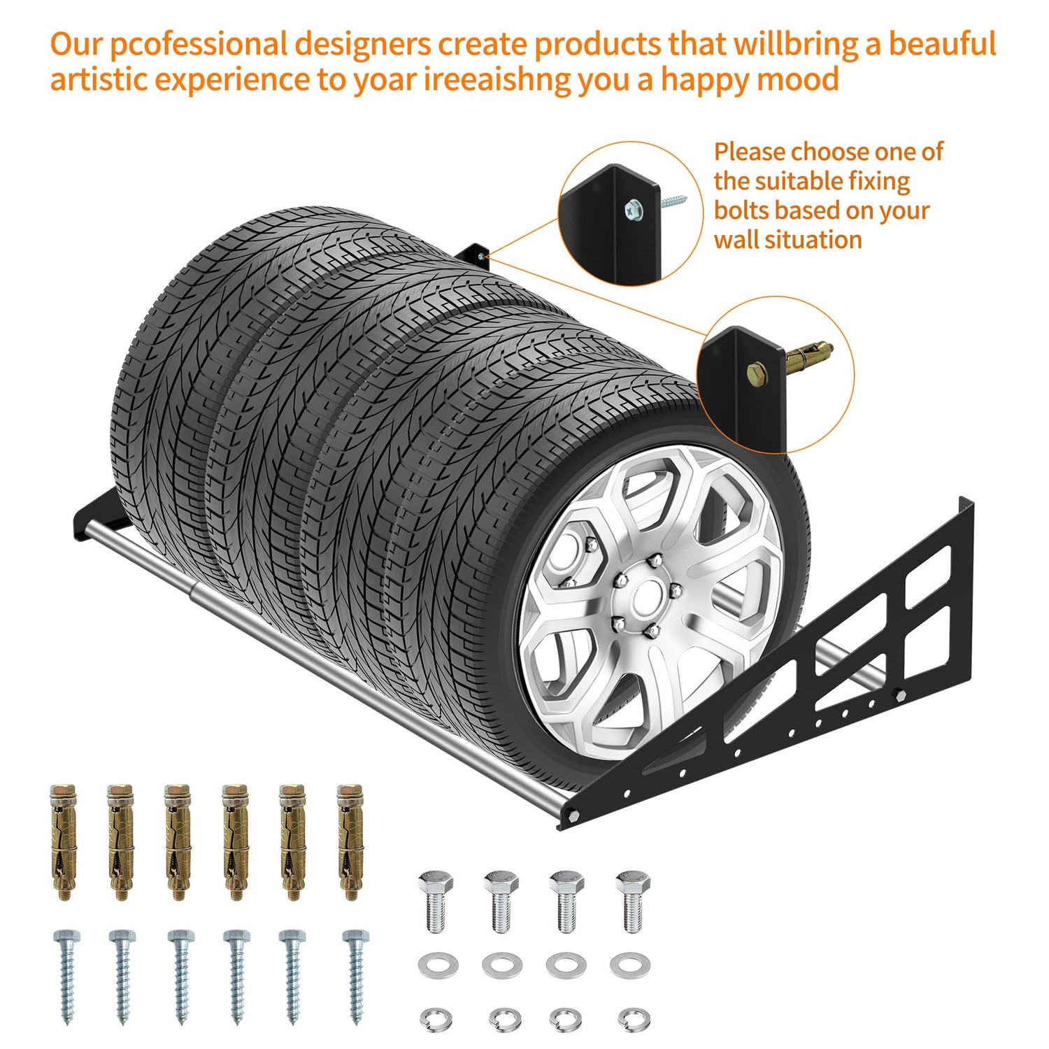 • 【Tire Storage Rack】: Our utility racks have textured powder-coated frame brackets, The heavy duty wheel rack holds up to 400 pounds, easily storing 4 standard size tires. Our professional designers create products excellent wall storage solution will bring a beautiful artistic experience to your life
