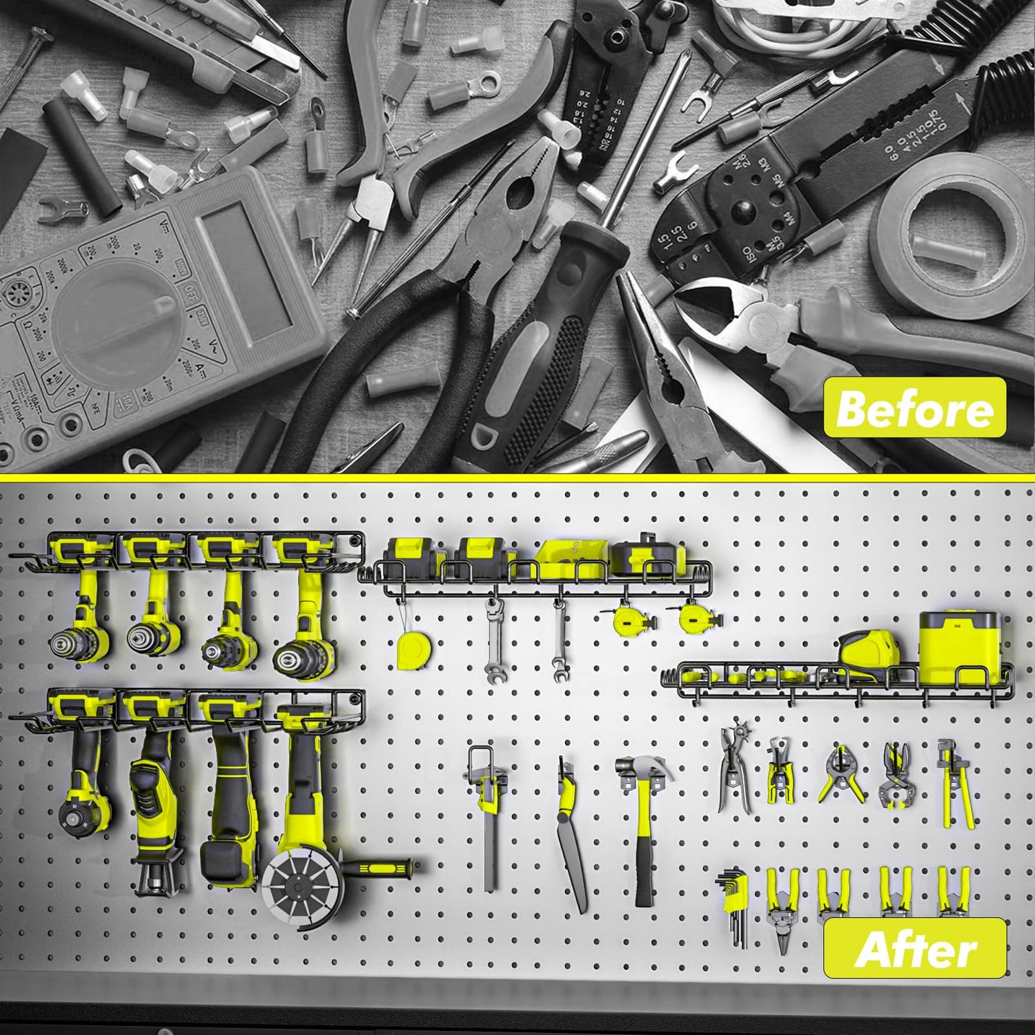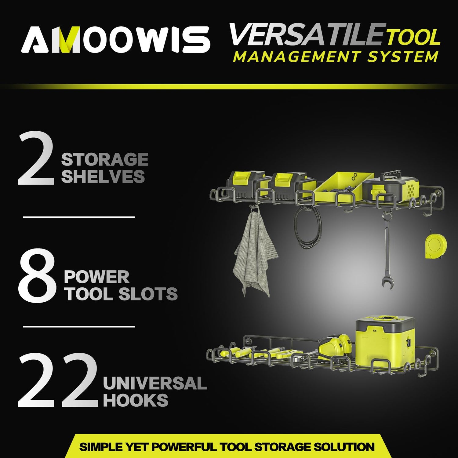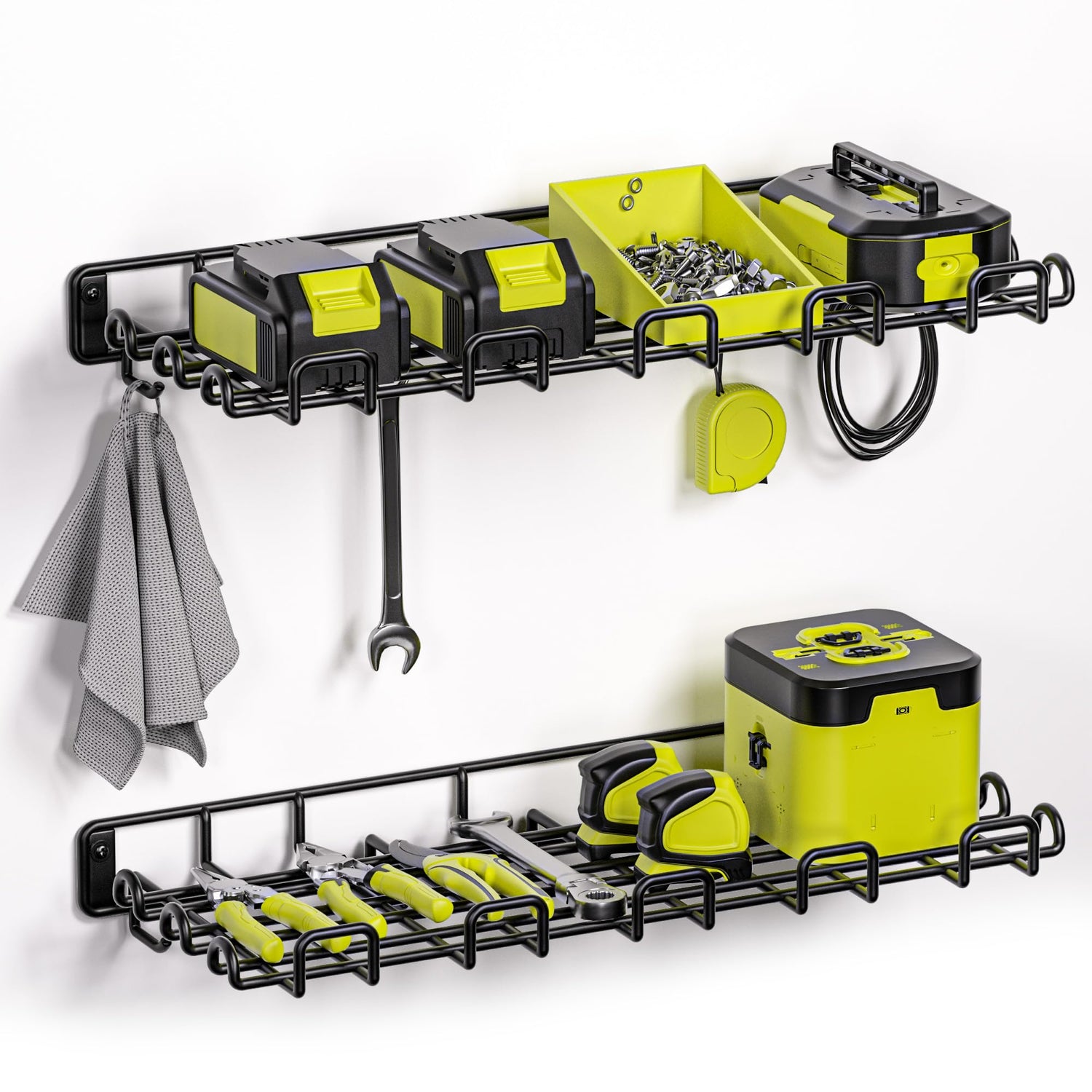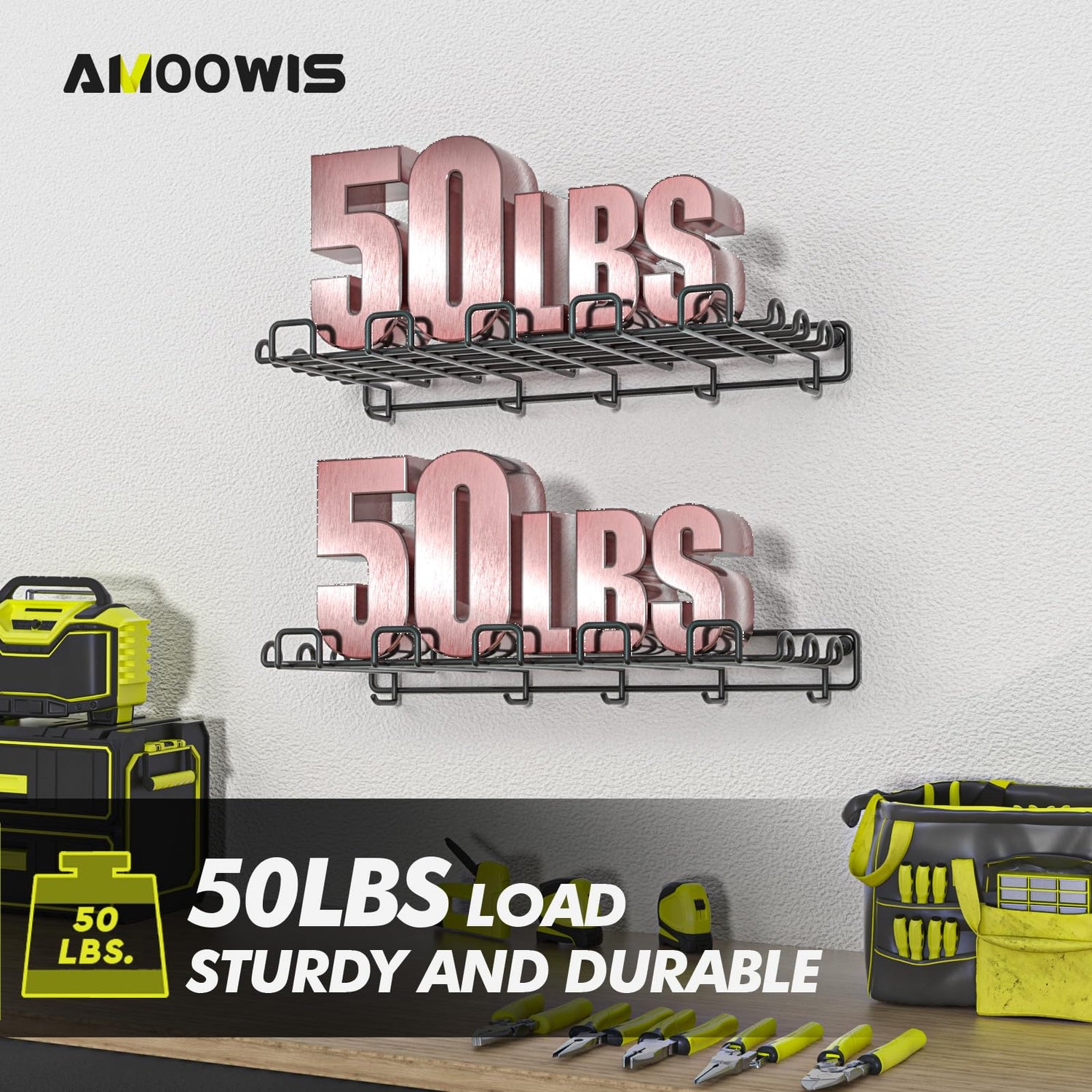 • Sturdy structure: The wall-mounted shelves in the garage are made of high-quality steel and coated with powder for a good structure. They are durable and can hold 50 pounds/shelf. The hook design on both sides and the bottom makes it convenient for you to hang things as you like