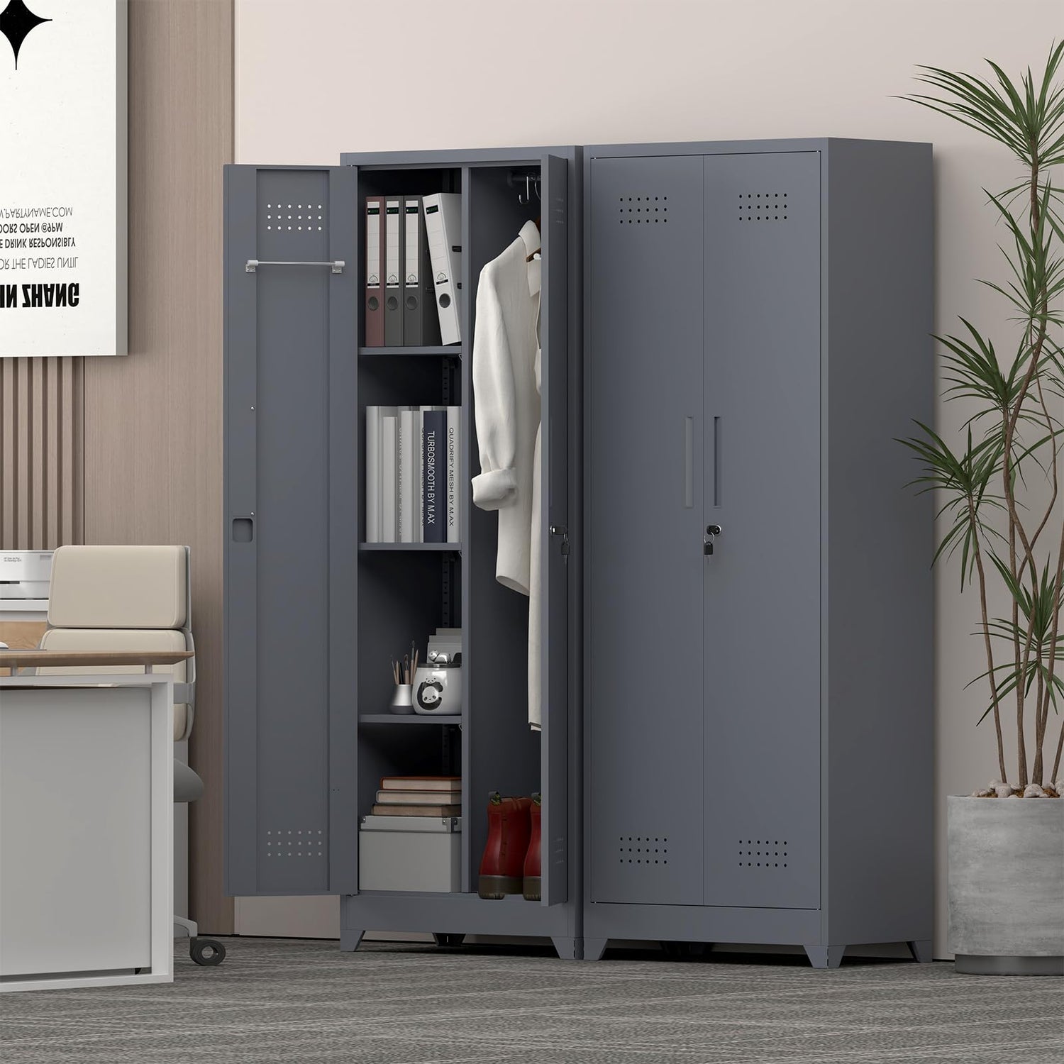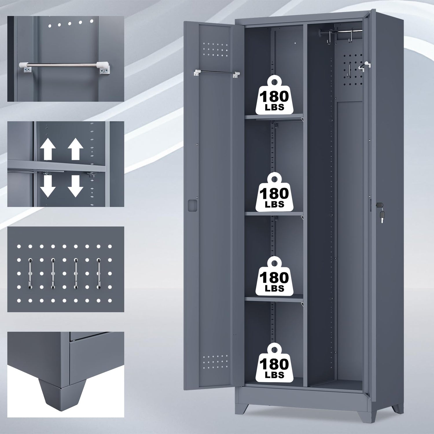 • 【Secure Locking & Ventilation System】Equipped with lockable doors and strategic ventilation, this locking cabinet with shelves provides protected storage for brooms and mops while preventing moisture damage, making it ideal as both a metal garage storage cabinet and secure storage locker for garage environments.