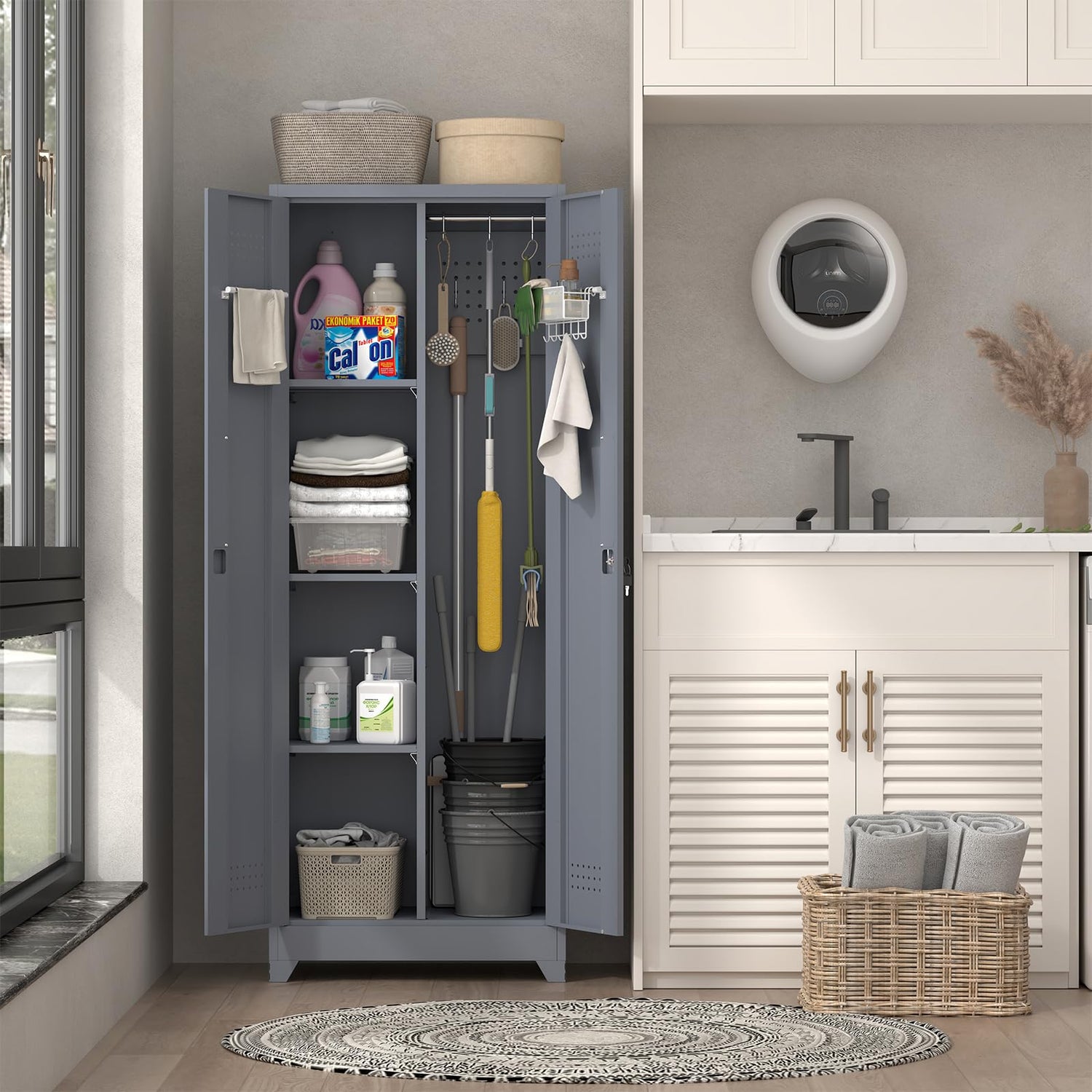 • 【Multi-Functional Utility Cabinet】This all-in-one utility cabinet serves as a complete cleaning supply cabinet, laundry storage cabinet, and garage tool storage cabinet, while also functioning as an efficient storage closet with doors for office, bathroom closet storage.