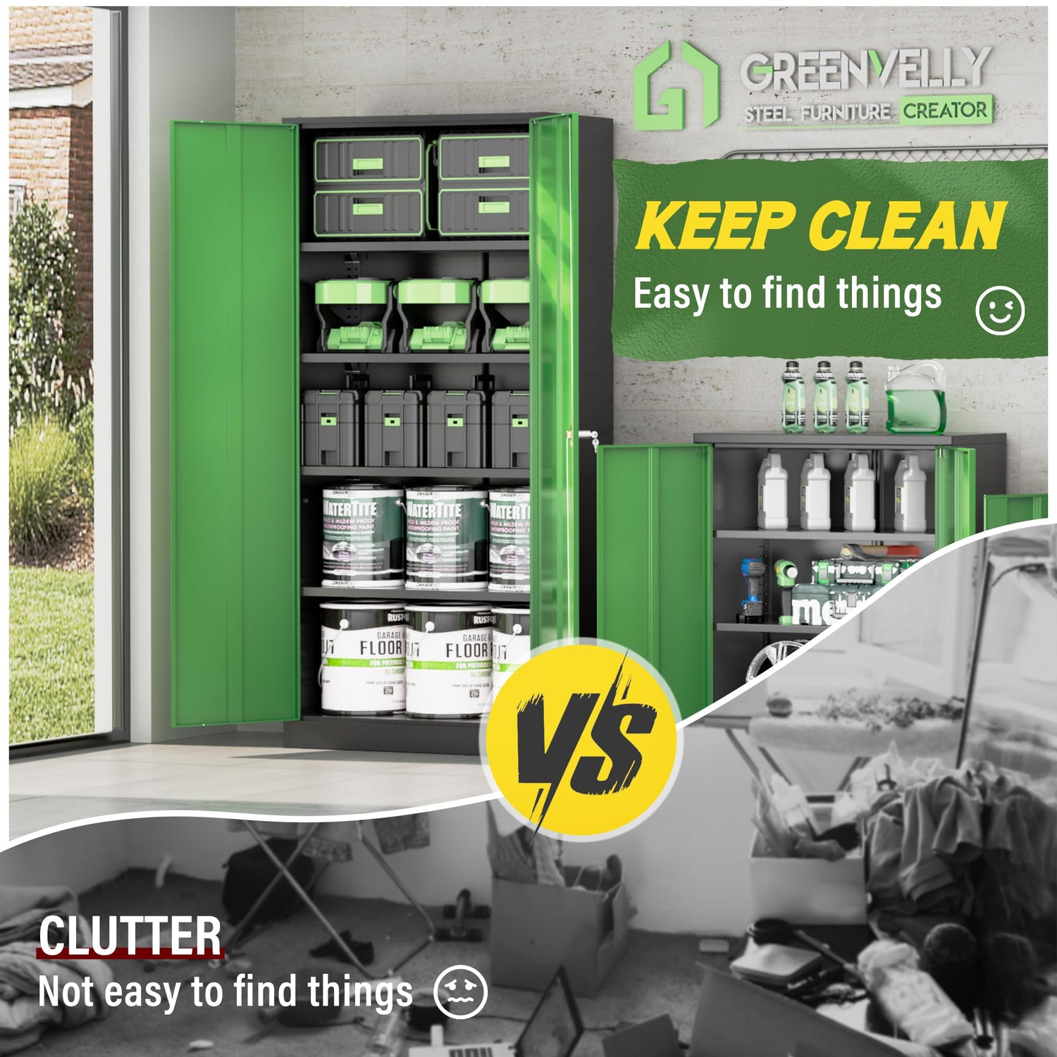 - [Solid & Durable Material]:Greenvelly metal garage storage cabinet with doors and shelves made of high quality cold rolled steel with steel plate thickness of 0.8mm.Each shelf could hold up to 180lbs.The surface of the steel plate uses an advanced painting process to prevent corrosion and rust, making it suit for wet or high temperature environment, and easy to clean.