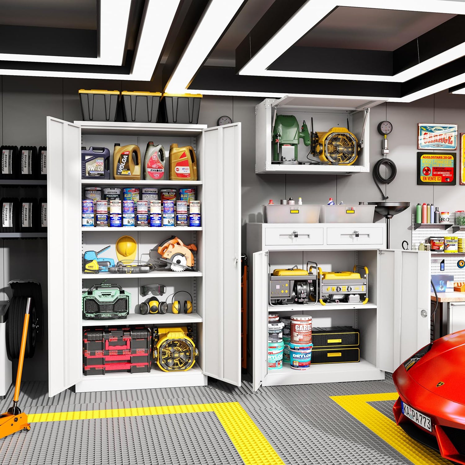 Designed with versatility in mind, the Greenvelly metal garage storage cabinet features two drawers and adjustable shelves, allowing you to customise your storage solutions to fit your daily requirements. Unlike traditional wooden cabinets, the robust steel construction offers superior corrosion and moisture resistance, making it a reliable option for various environments such as garages, utility rooms, and car repair shops.