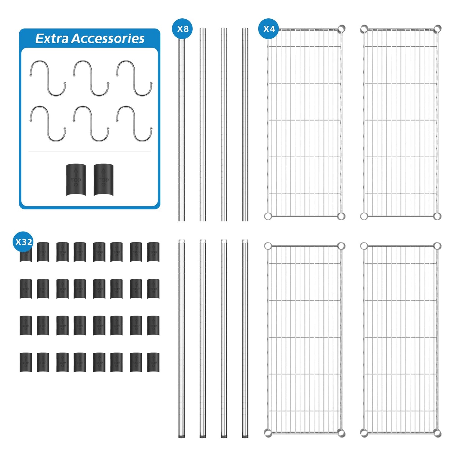 • What You Will Get: This Wire Shelving include: 4 pieces of Metal Mesh Board, 4 pcs Upper Pole,4 pcs Bottom Pole, 32 pcs Clips; Additionally, an additional 2 clips and 6 metal hooks are included