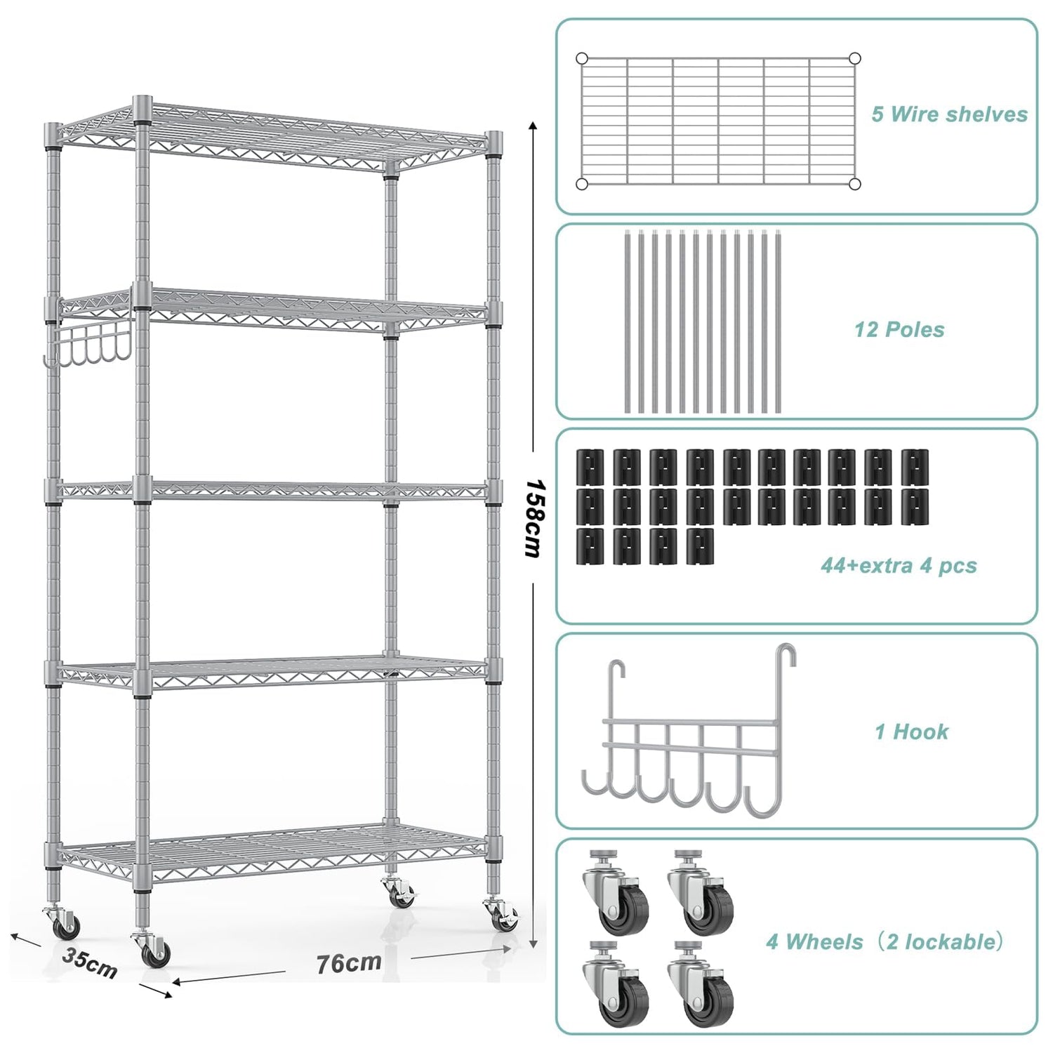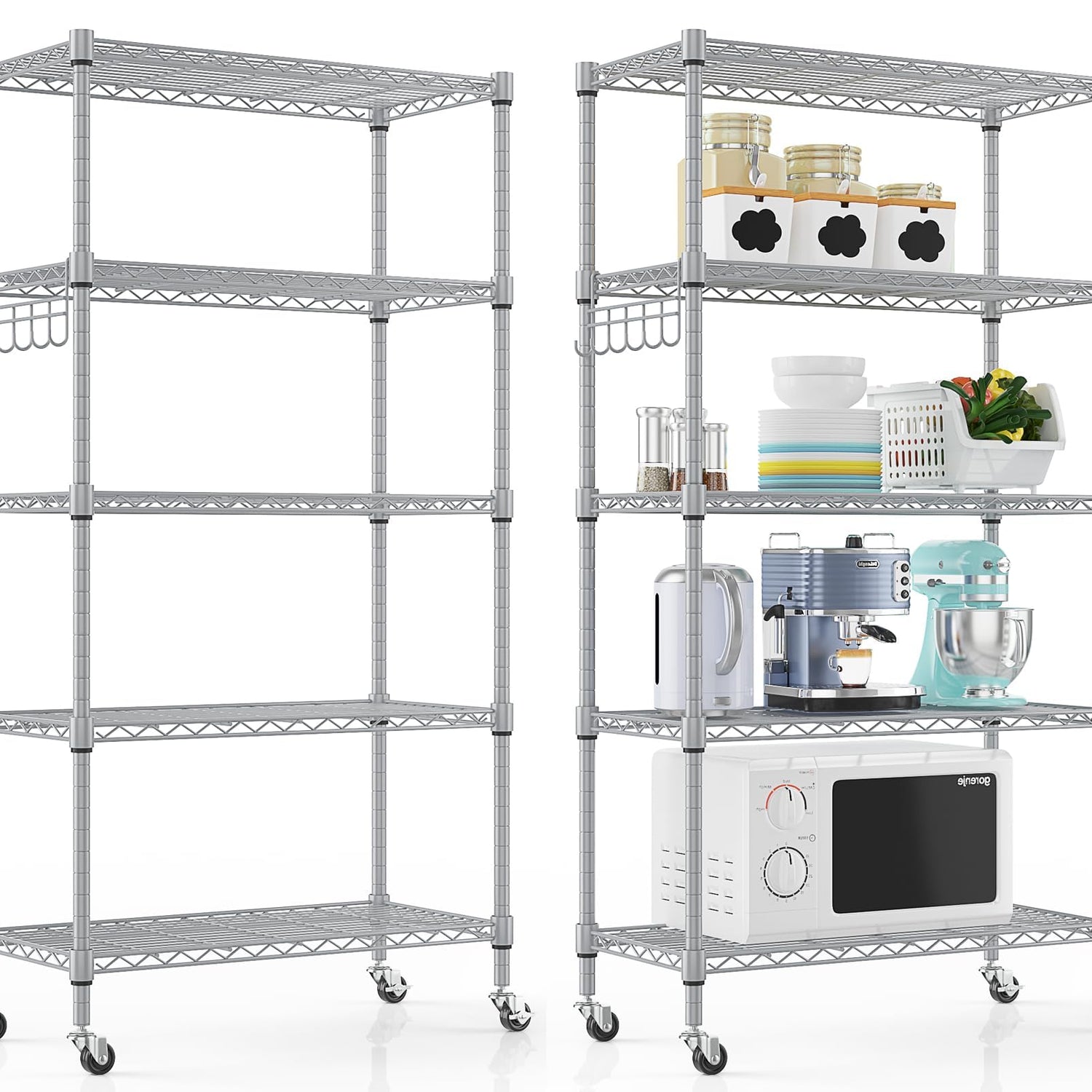 Himimi 5-Tier Storage Shelf Wire Shelving Unit on Wheels, Adjustable Heavy Duty Metal Shelves with Side Hooks, Steel Rack Organization for Kitchen Garage Basement, Silver