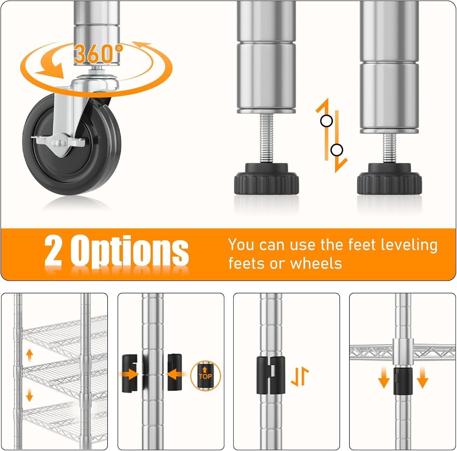 - 【ADJUSTABLE HEIGHT】Each layer of the wire shelf can be adjusted to match the height of your items, optimizing your storage space.Additionally, you can join two storage racks to form a wider unit, providing extra width to meet your needs.No matter your requirements, you can assemble a shelf configuration that fits just right