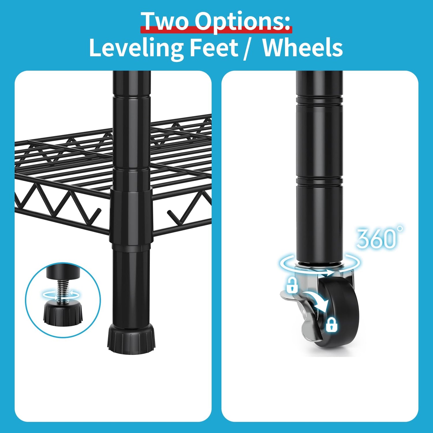 - EASY TO MOVE AND STAND - Comes with 4 commercial-grade wheels and 4 leveling feet. Wheels provide smooth, silent rolling, and protect your floors from scratching, 2 of the lockable casters (foot-operated) can hold the metal shelving unit in place when stability is required. Leveling feet allow the wire shelf to easily level on uneven floors.