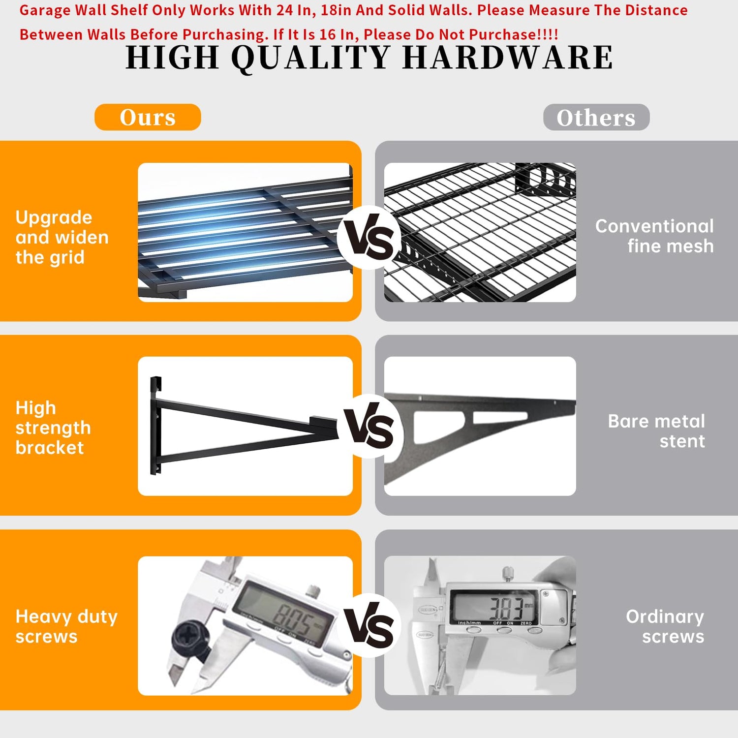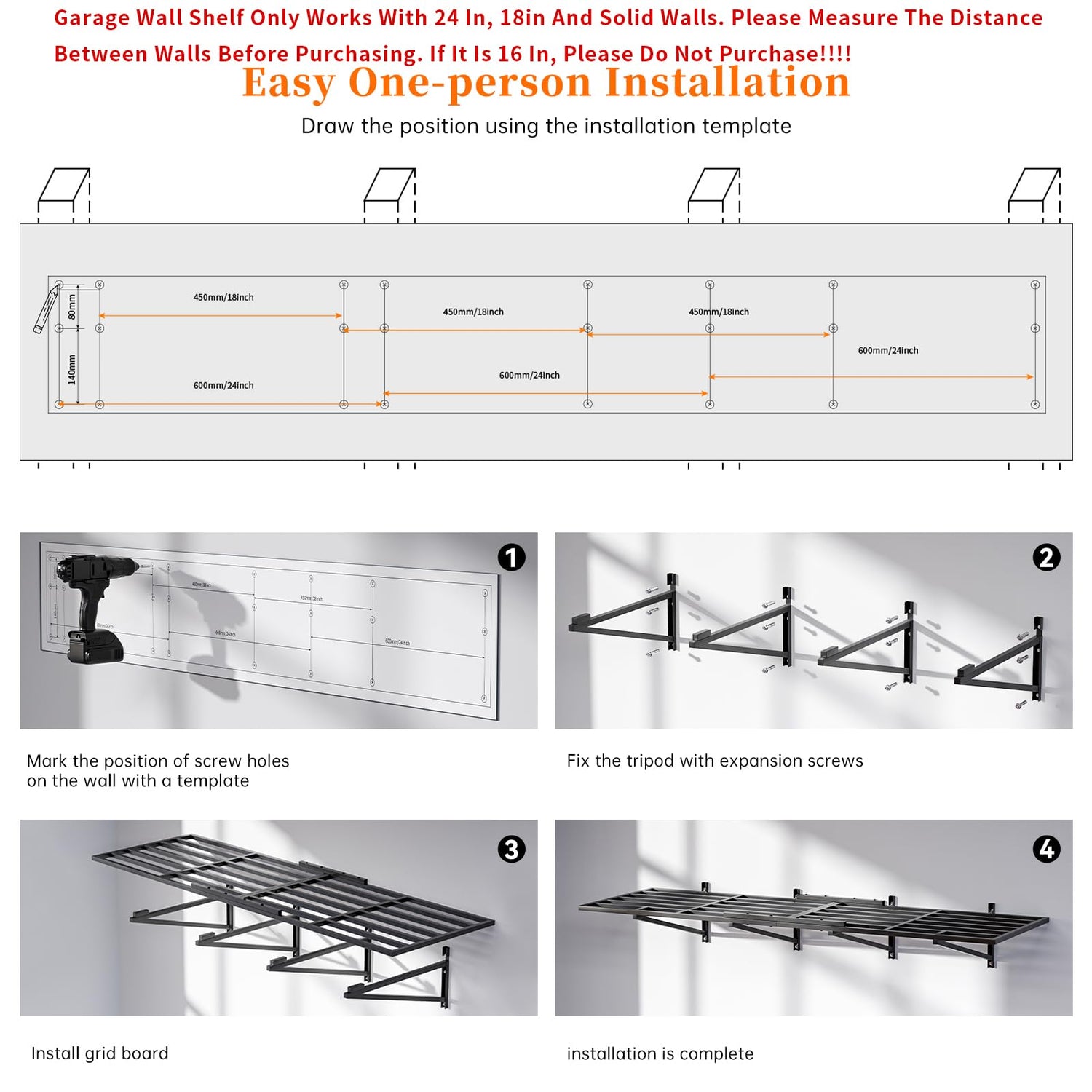• Versatile installation: The garage wall rack maximizes floor space while easily mounting on concrete, brick or stud walls. The garage wall rack is only suitable for 24", 18" and solid walls. Please measure the distance between the walls before purchasing. If it is 16", please do not buy it!!!